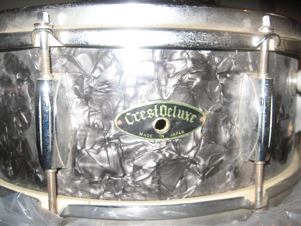 Here is one of the earliest complete MIJ sets that I have seen. Black diamond pearl 13/16/22 and matching 14" snare. Gretsch copy lugs and what looks like a Radio King style strainer system on the snare drum (dual adjustment!) The badges are black and silver foil stickers.