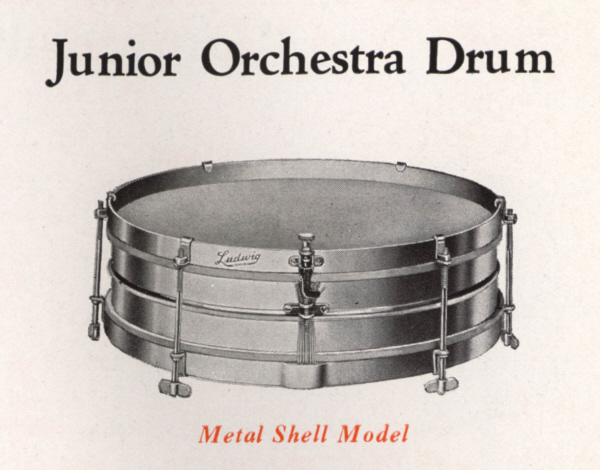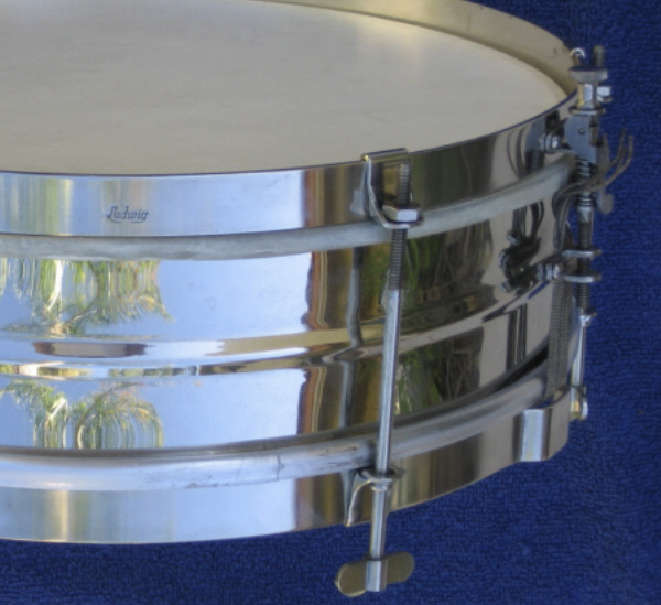 Back in Aug, 2009 I posted pics of a Ludwig Model 4395 I have. http://www.vintagedrumforum.com/showthread.php?t=12642. Because this model was produced relatively unchanged from the mid-1920s through the 1940s it seems difficult to date my specific drum. All catalog pictures of the model show a medium sized "Ludwig" script engraved at a angle across the batter hoop (see the first pic below), except in 1929 and 1930 when it is on the shell. The script on my drum is somewhat smaller and parallel to the hoop. My question is, does this difference allow for a more specific dating of my 4395? I'd like to know exactly (within reason) how old it is. Thanks