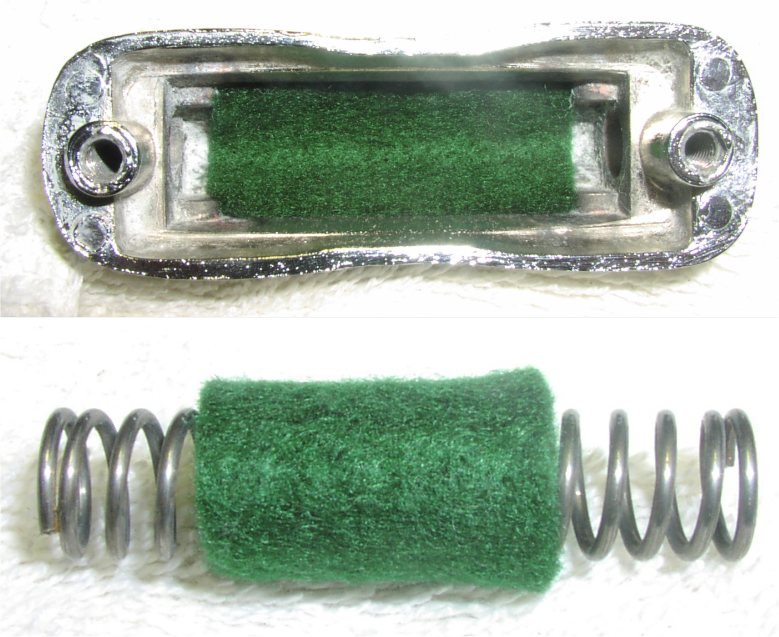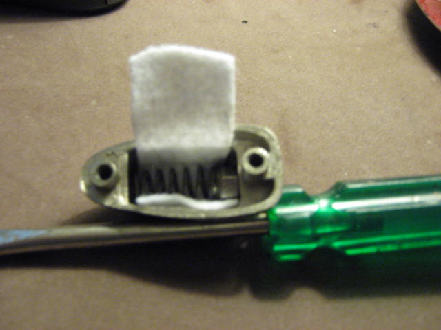 Also, I have a question. Check out the pictures of the lug that I packed. So far, all the drums I have restored, I packed the lugs with felt. The way I do it is to place a small piece into the lug before I place the spring and inserts as shown in the first pic.