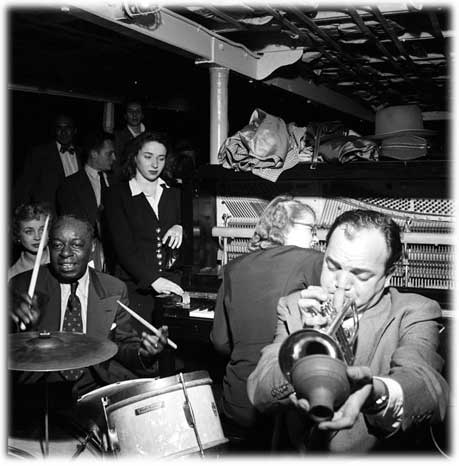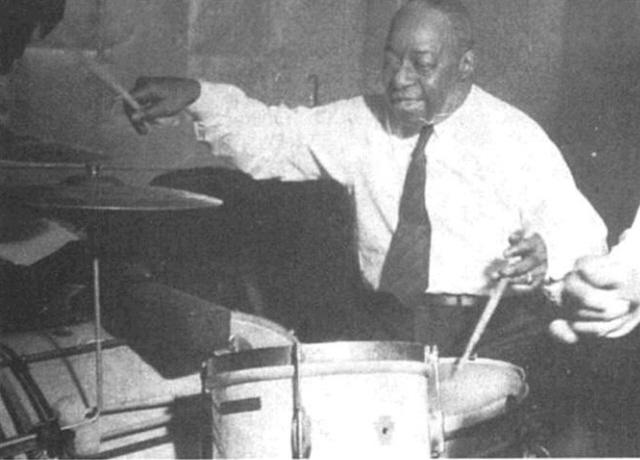 A story has it that Gene Krupa gave Baby Dodds some drums (a set???) and it appears to me that Dodds added two WMP Tom Toms to his set after he already had a WMP tube lug Bass drum. Are these supposed to be some of the drums Krupa gave to Dodds? At least one of those added toms (probably both toms were the same single lug style from WFL), the one that is in the position that the earlier China Tom occupied, is a 30s WFL (at least that’s what the badge looks like in the photo I’ve posted). Krupa endorsed Slingerland in the 30s so I find it a little weird that he would give Dodds a WFL WMP Tom Tom. Or did Dodds actually get these drums on his own or as a gift from WFL? Anybody got the scoop on this?