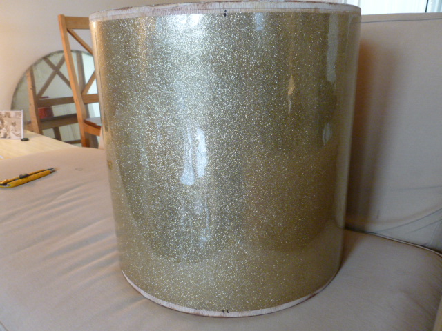 So this is Dura-lar plastic sheeting, Recollections gold sparkles from Michaels Crafts, Krylon "triple thick crystal" clear glaze, and wood glue. The clear glaze goes on the plastic, the sparkles get dumped all over that, then shaken off [excess reclaimed], then let it dry, then coat the shell in wood glue, then apply, rough side down.