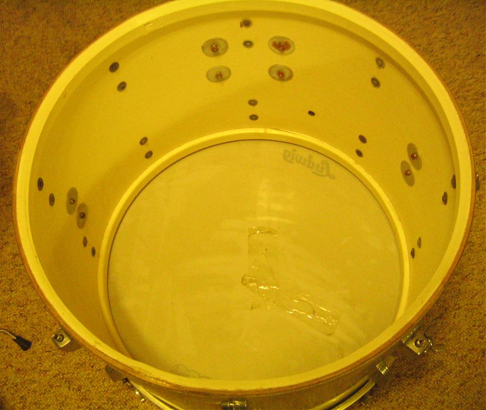 I was pleasantly surprised to find that the drum is in remarkably good shape, despite being very dirty and in need of some TLC. The rail consolette is complete; all rods and Ts are accounted for. Spurs and cymbal rod are missing. The hoops have lots of black tape on them; I'm not sure what they will look like, but I'm hopeful. Here are some "before" shots, along with the drums I'm completing the set with. These are all late 60s, and the wraps are a very close match. I know, that's a 16", but it will have to do! Those 14s are too rich for me! I know that it was a bit of a strain to shell out $350 (including shipping) for this bass drum! But I'm glad I did. I'll post some "after" pics as soon as I get through cleaning it up!