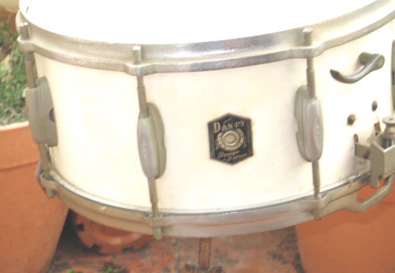 It is timber in white and has never been restored or cleaned. The only work was when I took it to drumworx some years ago to have it skinned. The badge is “Dandy Drouyn & Drouyn” with the six points. All the hardware is original including the metal swivel stand. I am a muso but not a drummer so, depending on what it is worth it may have to make way for more Guitars.