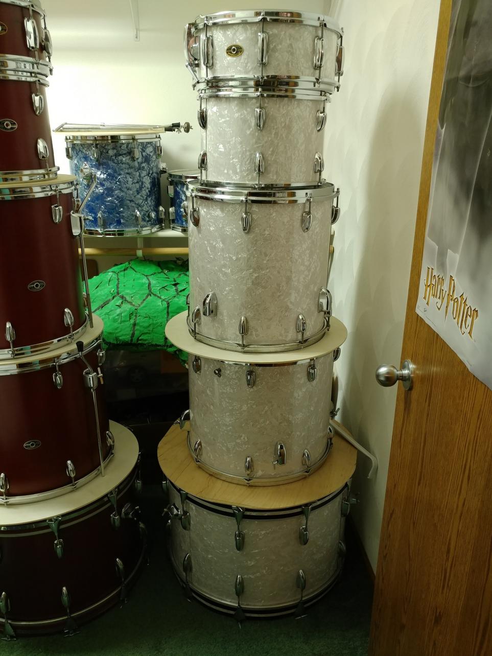 #1 is a Slingerland kit re-wrapped in WMP from Jammin Sams. The wrap was done by me using the tape method. The shells are 3 ply with rings. All drums have maple interiors except the 13”, its mahogany. Sizes are 13,16,18,24 and the snare is a 14”solid maple shell that has gone through some major repairs. Heads fit tight on the snare drum but it plays great. These drums were pieced together with parts from VDF and Ebay, some parts might not be correct but they work. [COLOR="Red"][SIZE="4"]SOLD[/SIZE][/COLOR]