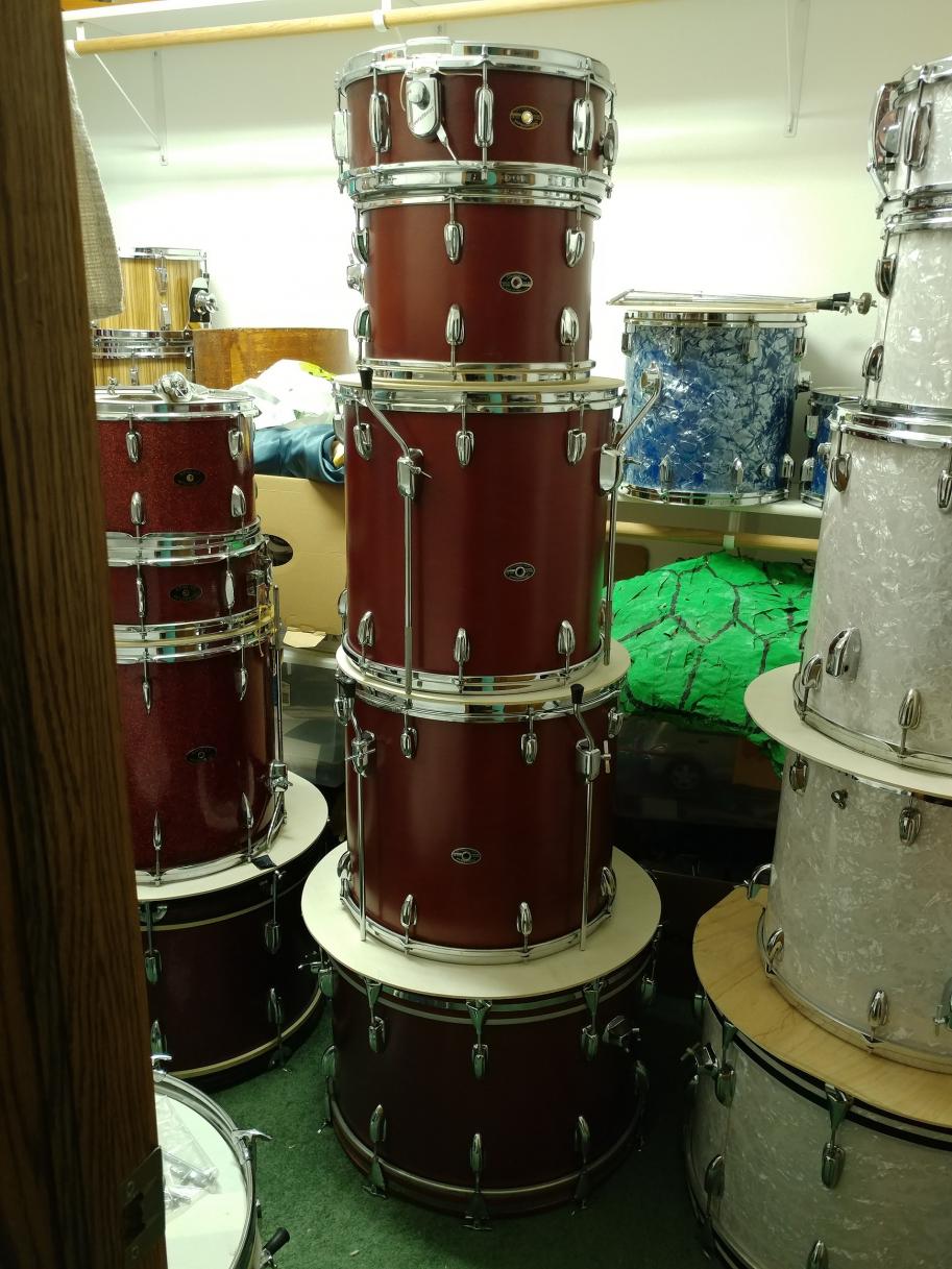 #2 is another Slingerland kit. The shells were purchased from Ebay. The shells are five ply. Most of the hardware came from a member on VDF. The hardware was stripped from one of those Slingerland kits with cardboard shells. The sizes are 13,16,18,22 and the snare is a 5x14 3ply with black and gold badge. The 16” floor tom is a five ply with maple inside and mahogany out that I veneered with maple. The finish is a red dye I had sitting around the shop which actually matched the interior pretty good. They are finished in a satin lacquer (conversion varnish). [COLOR="red"][SIZE="4"]700.00[/SIZE][/COLOR]