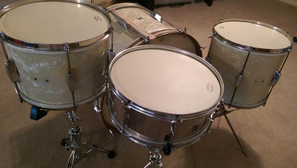 The White Marine Pearl looks very nice. There ARE places of discoloration which is typical of an almost 80 year old kit, but as you can see by the pics, this is a sweet looking kit! All the seams are nice and tight and the wrap is intact and in GREAT shape. It shines beautifully! I have TONS of pictures available in you need more information.