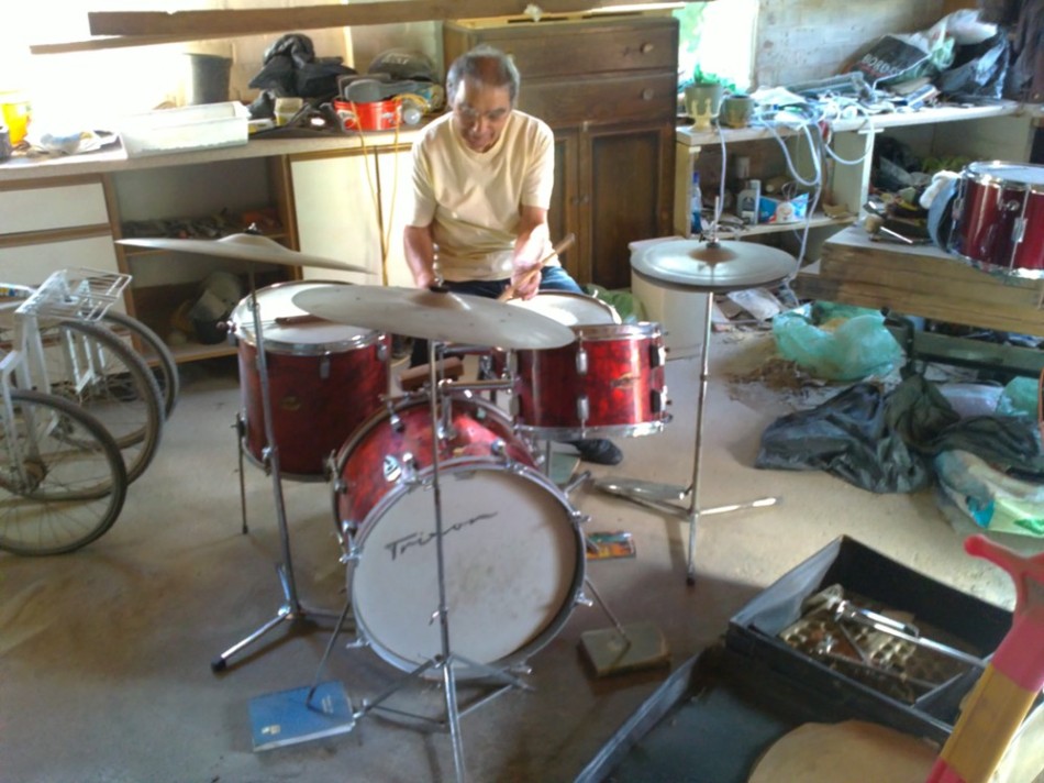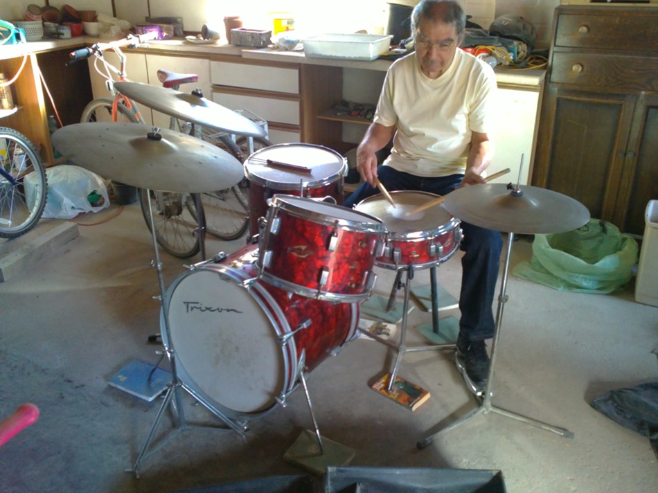 An old guy from work was moving home a couple of weeks back and with myself being in a band asked if i was interested in his old kit out of his garage. Could'nt believe it when I got round, lovely vintage Trixon kit. From searching the net it appears to be a Trixon Luxus which he bought second hand in late 62/63, cymbals he said he bought around 57 but not sure what the make is as can't see any stamps. I've attached a couple of pics with the old guy having a play.