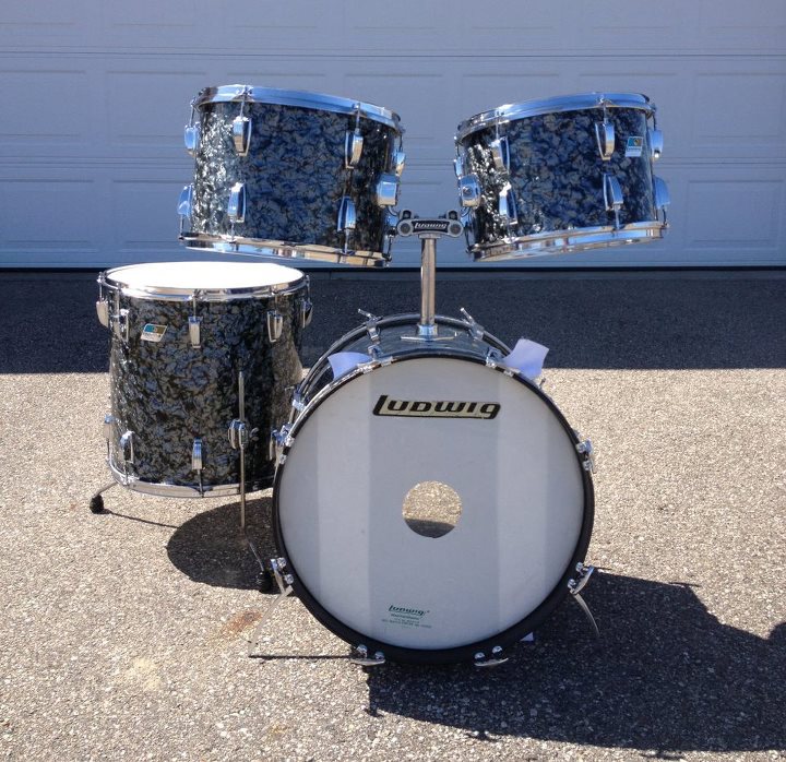 Recently I picked up this kit. Just got it cleaned and finally put back together today. This is very odd because I believe it is all original but the sizes are 20, 16, 14, 13. The wraps all look great. I almost dare say no fade at all. A little bit of shrinkage at the seems but no where close to any wood showing. The rubbers on the FT legs are missing. There is some slight pitting and scratches on lugs and other hardware. Has granitone interiors and they are quite nice as well. Bass drum has some scratches inside.