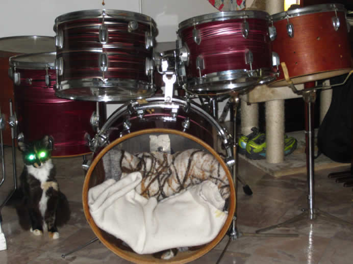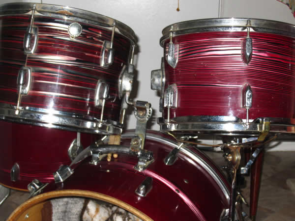 The two brown colored wood toms I believe are '60s slingerlands (did not come with kit) and the snare is a mid '70s blue/olive Ludwig supraphonic that also did not come with the kit.