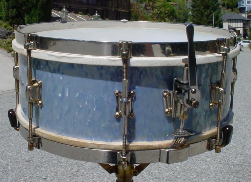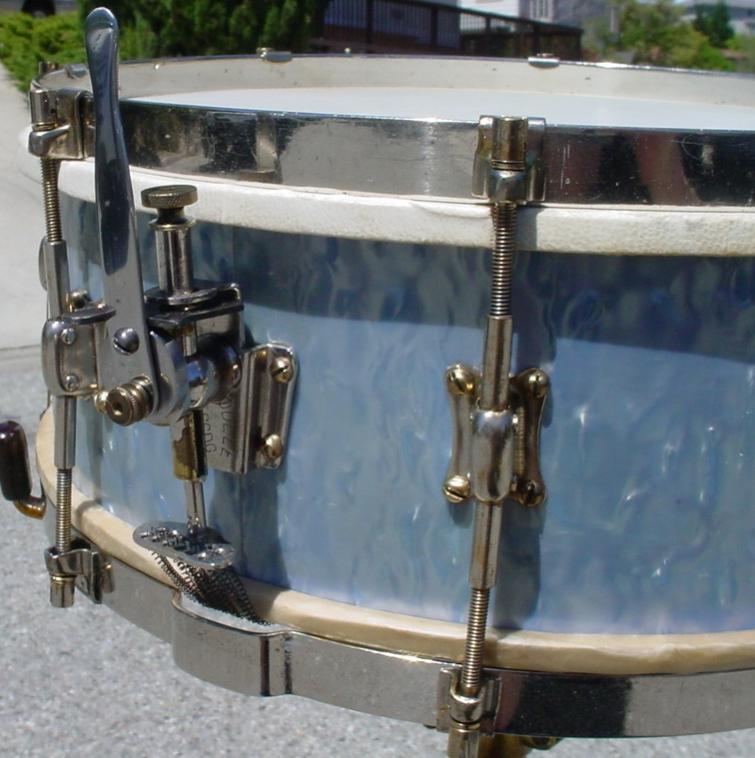 the shell/bearing edge/snare bed/wrap/reinforcing rings : the shell is composed with 3 ply. The reinforcing rings are in ash wood, with a 30 ° bearing edge, and snare bed is wide enough for the time. The wrap is a pearly blue celluloid.