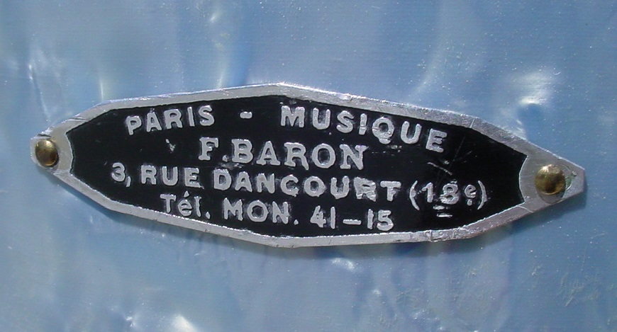 the brand : F. BARON: It was a music store located in Paris, which existed in the 30/40 years. Very little information exists on this music store, but they created a brand "CONTINENTAL Paris New York", drums and snare drum which are so rare. This music store probably hasn't manufactured its musical instruments, and this snare drum... They maybe have been manufactured by Parisian craftsmen Hustier & Beau ; the inventors of those lugs and this strainer. These two Parisian artisans had been probably visited by Georges Way during its European tour in London and Paris, for the promotion of Leedy ... These lugs are clearly inspired by the Leedy lugs !!