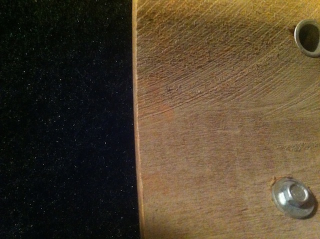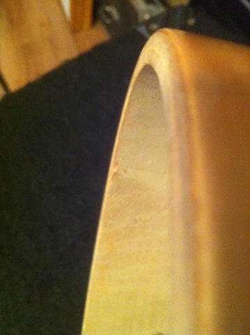 Here are two shots of the Slingy 8 inch tom with absolutely zero bearing edge cut that I was speaking to in my previous post. Hope this sheds a bit of light on this topic. This is not just a weak edge ... it's no edge at all. Completely flat.