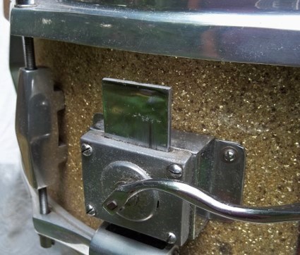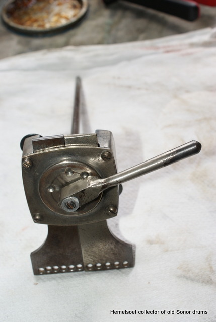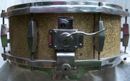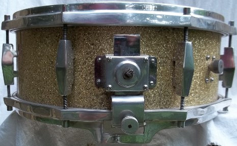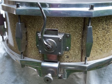 Hoops are nickel on cast aluminum( very similar to early Trixon, Deri, Tromsa and Lefima 50's hoops, in shape, height and construction). The lugs are also nickel on cast aluminum ,mounted U style , as though in a different incarnation they were meant to straddle a hump. T- rod heads are 9mm---similar to Sonor and Rimmel, chromed and the threads are fine, metric. Most of the threads on German drums were coarse( Trixon , Tromsa were exceptions). The parallel throwoff is immaculate and exceptionally precise. The wires are very thin and responsive 16 strand, carbon steel.