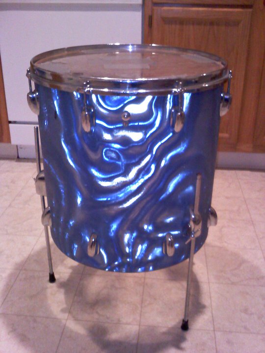 That looks like a slingerland to me,stick saver hoops,probably maple int,like James said early 60's drums toms and floors did not have badges.The P means that the drum was supposed to recieve a pearl covering or wrap,slingerland was the only company to do this as far as I know.The floor tom legs mounts look right to me also.That finish is called blue satin flame and was offered from 1964 -1978.Don't call me on it but I think badges on the toms started in 1967,I would date your drum from 1964 to 1966.