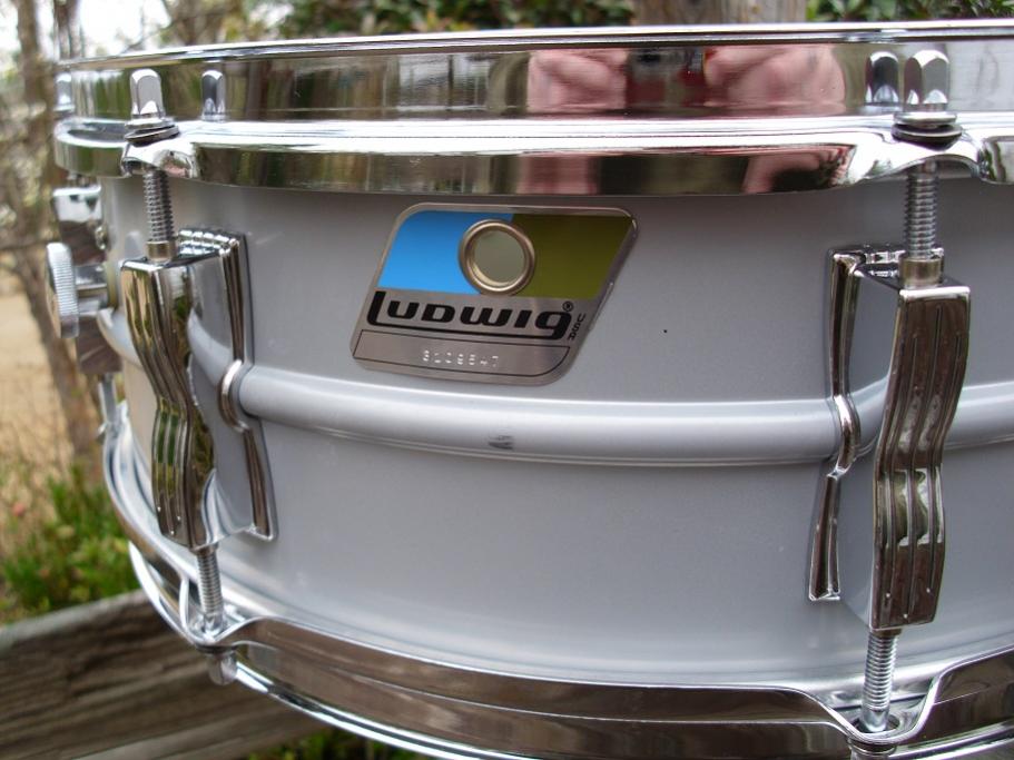 this is a rounded corner blue olive badge 5x14 8 lug acrolite. the serial number is 3109547. interior of shell is stamped 288. the hardware on this drum is flawless. has a black face 2 hole p85 that works smoothly. has matching block logo snare butt. original 20 strand chrome Ludwig wires and original snare cords. this model has the large round knob muffler. has original Ludwig rockers batter head and original Ludwig x-thin snare side head. this is the cleanest acrolite that ive had in my hands. look at the pics!