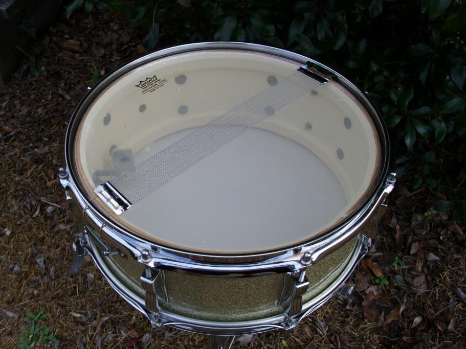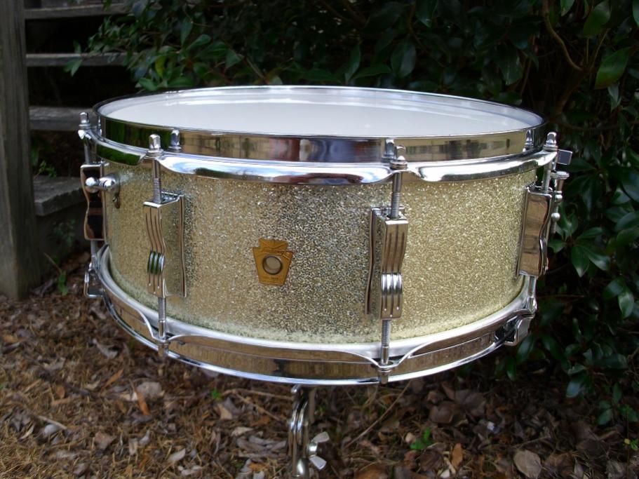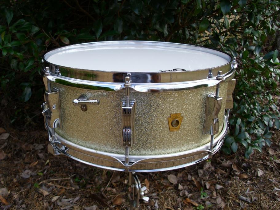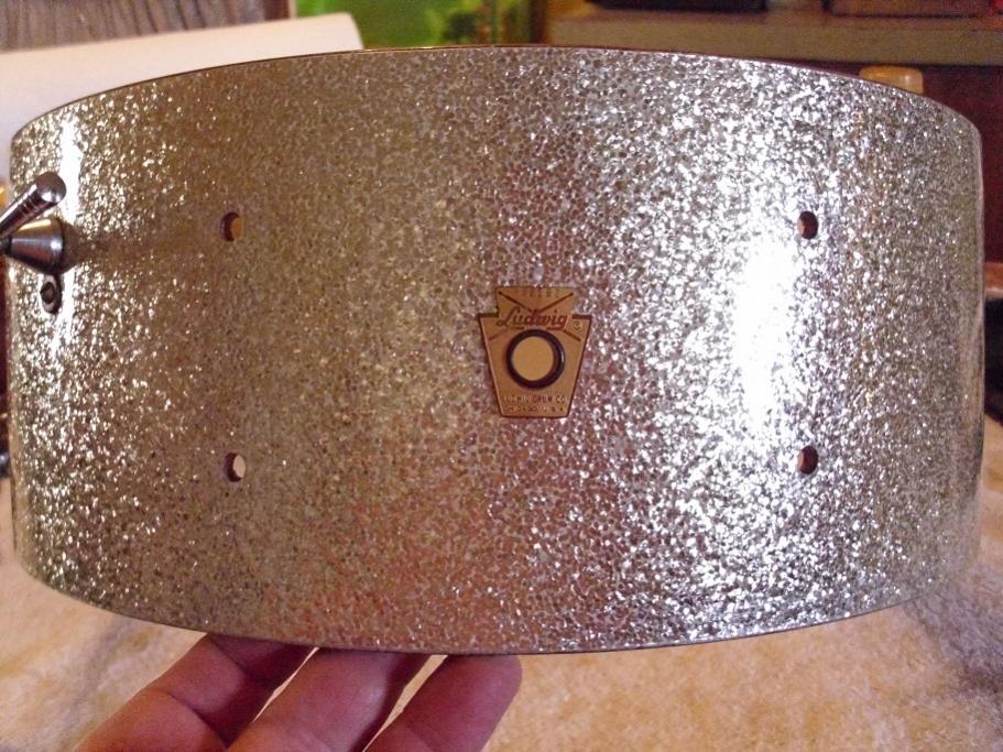 This is a 5.25" x14 8 lug Ludwig Jazz Festival in Silver Sparkle. No date stamp inside but most likely a late '66 drum based on the 382192 serial number. This drum is in very nice condition. It is completely original with the exception of the heads which are a fresh Corders smooth white batter head and an older Remo clear Ambassador snare side head. This has the white felt baseball bat muffler, P83 strainer and Ludwig script logo 18 strand chrome tip original wires and snare cords. Very little fade on the shell as shown with the picture of the bare shell. Bearing edges and white resacote interior are beautiful as is the chrome hardware. The hoops have a few finish imperfections but still look nice overall. All original tension rods and brass washers present. The wrap is near perfect on this one with no scratches or any issues at all. It has "the sound" as most of these old 3 ply Jazz Festivals do. I have completely detailed the drum and it is ready to play. Please feel free to pm me here or email to [email]mikelayton@bellsouth.net[/email] if you have any questions. I will pack it well and ship it quickly. Thanks for checking it out.