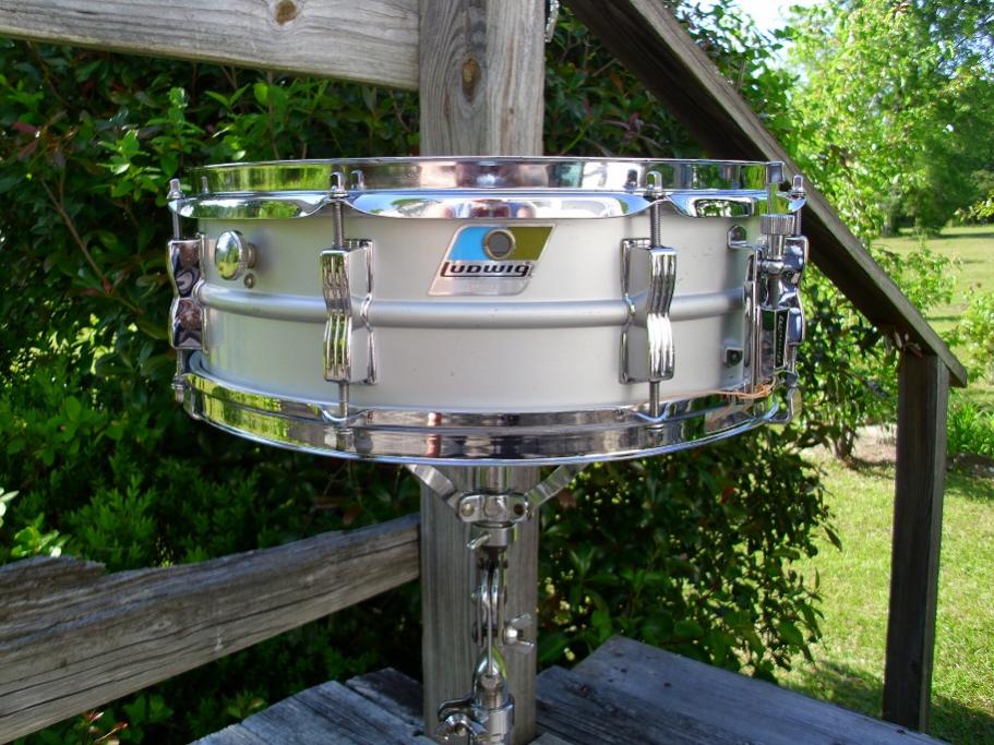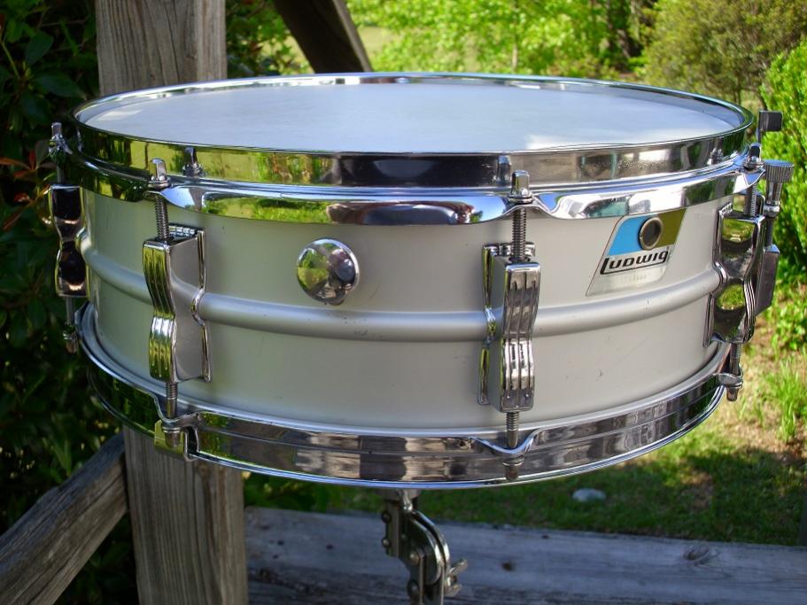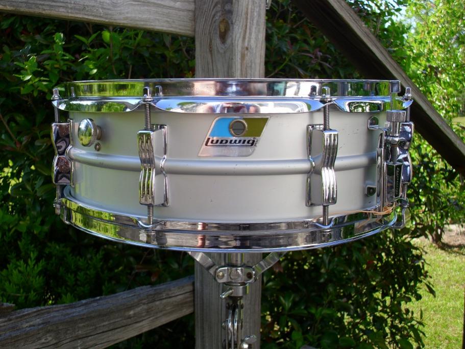 This a 70's Ludwig Blue Olive pointy badge 5x14 8 lug Acrolite. Serial number is 1783983. These have the light anodized finish and sound much like the earlier Keystone badge models. This is a good solid drum but has seen some playtime. The shell has no dents/ damage but does have some light scuffs and so forth. The blackface P85 strainer works perfectly. Has the block logo snare butt, 20 strand wires with new Ludwig cords. Has an Evans genera hd batter head and an Evans hazy 300 snare side head. The bottom hoop is a Ludwig replacement. Large round knob muffler works great. These are made from the same seamless shells as the Supraphonic and sound great. This one has been completely detailed, tuned and ready to put to use. Please feel free to pm me here or email to [email]mikelayton@bellsouth.net[/email] if you have any questions. Thanks for looking.