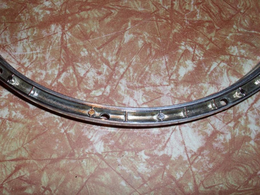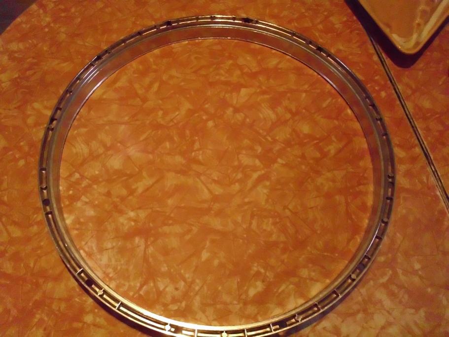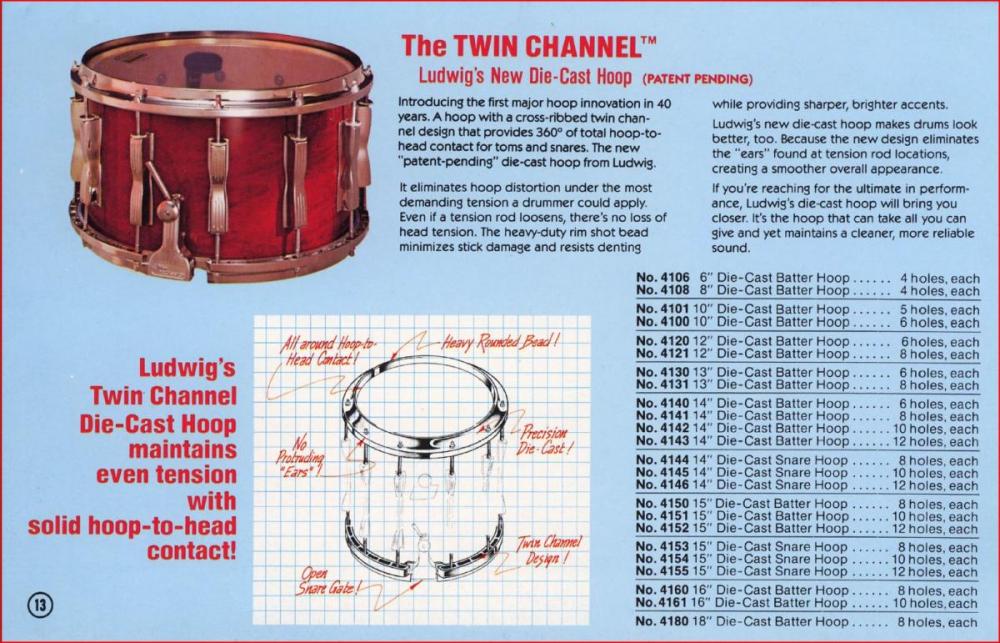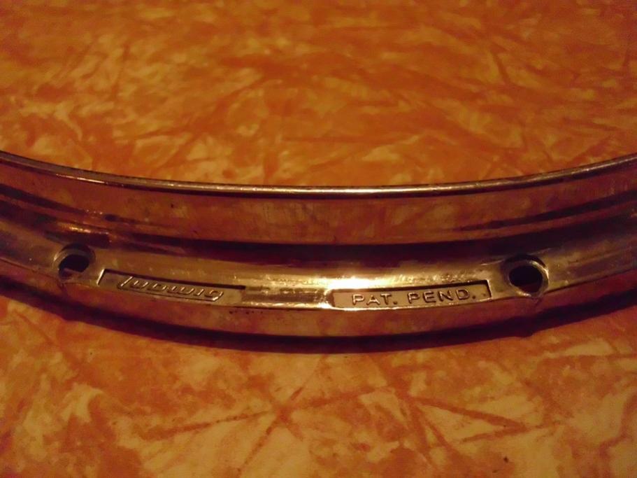I bought these awhile back for a 15" tom, but I needed the 10 hole model. this is a pair of Ludwig 15" 12 hole twin channel patent pending die cast hoops. these are almost twice as heavy as normal die cast hoops.a magnet does not stick to them. they may be brass. these are both identical. neither have a relief for the snare side. I think these were made for a short time in the 80's but can't verify that. I would also assume that these are high tension hoops?