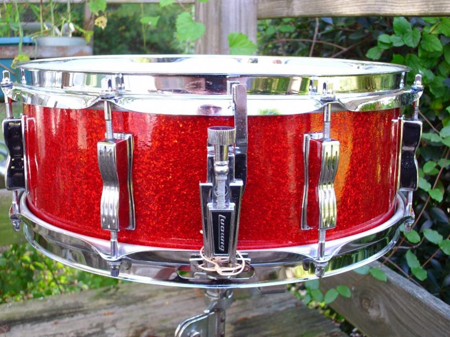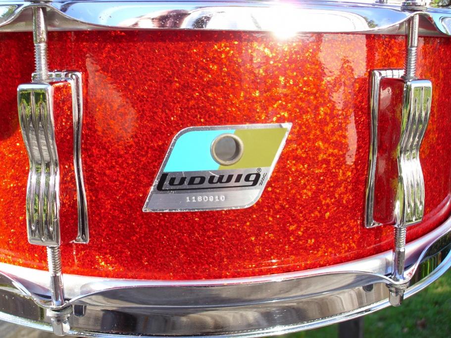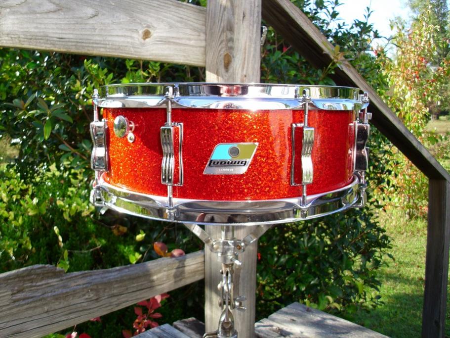 this is a beautiful Ludwig 5x14 pointed corner blue olive badge jazz festival snare drum. the red sparkle wrap is stunning with zero fade. this is a 3 ply drum with original granitone interior. drum is completely original with the exception of heads and new Ludwig snare cord. has a new remo coated ambassador up top and a hazy ambassador snare side. black face p83 works great. has block logo snare butt and one inch round knob muffler, Ludwig chrome script 16 strand wires. gave this one a fresh complete detail today and it needs nothing. the drum sounds as great as it looks. please pm me here or email to [email]mikelayton@bellsouth.net[/email] if you have any questions. pics should give you a good idea of how nice it is.