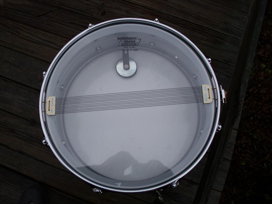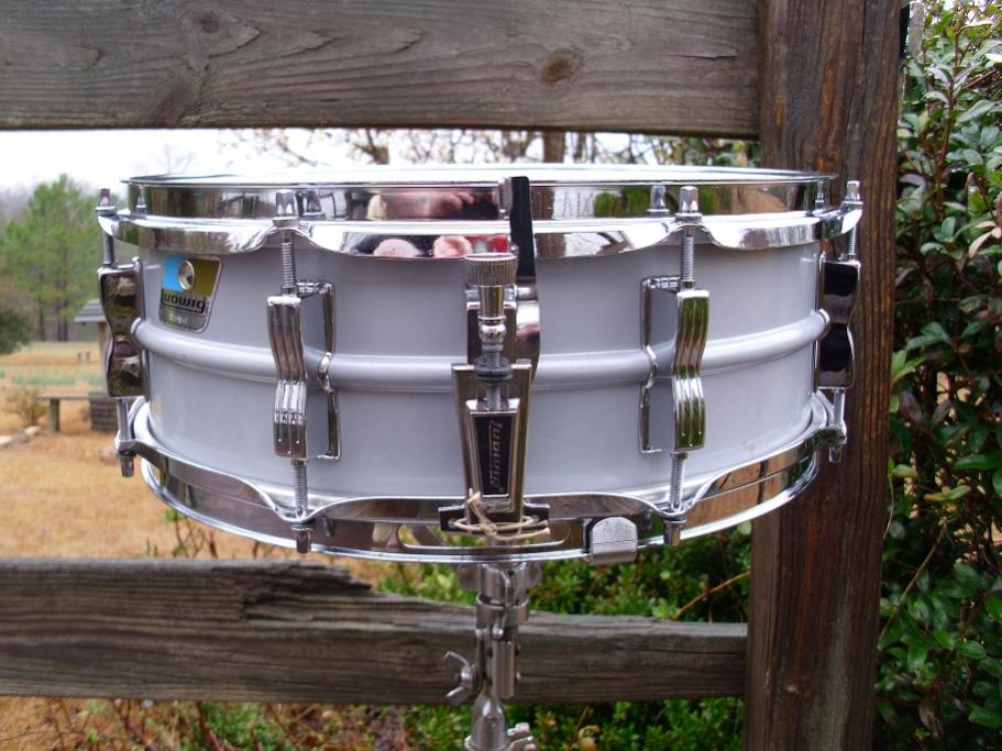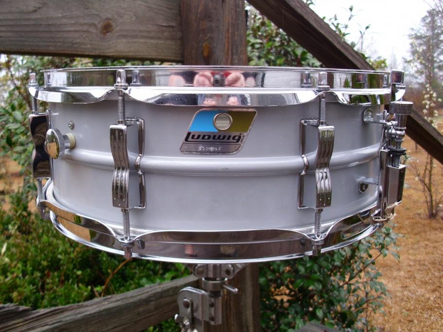 this is the way I like to find them! this is a blue olive round corner badge 5x14 8 lug acrolite. the serial number is 3008710. this one is completely original including heads,snare wires and cords. I have completely disassembled the drum for a complete detail today. the shell is in very nice condition and has no dings or major scratches. the hoops have a few blemishes, but look good overall. rest of the chrome looks great. black face p85 strainer works perfectly. has Ludwig block logo snare butt and 2517124 12 strand ludwig wires and original cords. one inch round knob muffler works fine. all original and matching tension rods present. batter is the original Ludwig rockers medium coated head with plenty of life left. original snare side Ludwig x-thin head on the bottom. its detailed, tuned and ready to play.