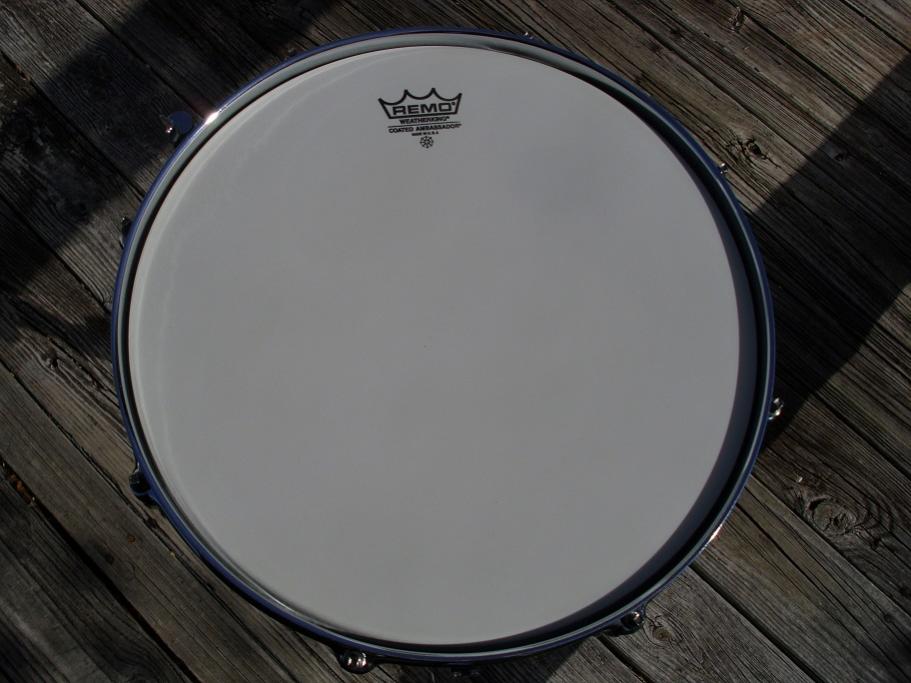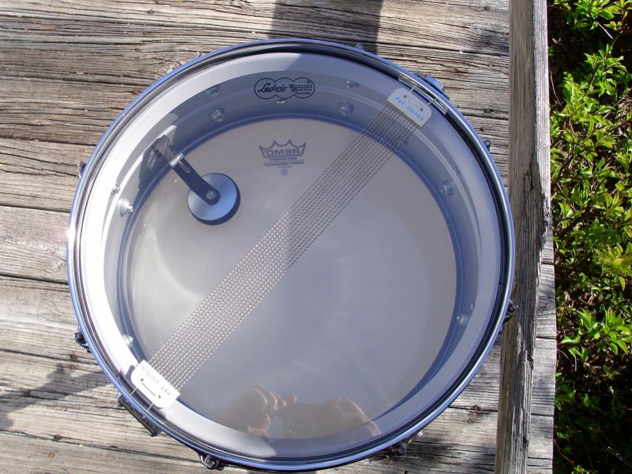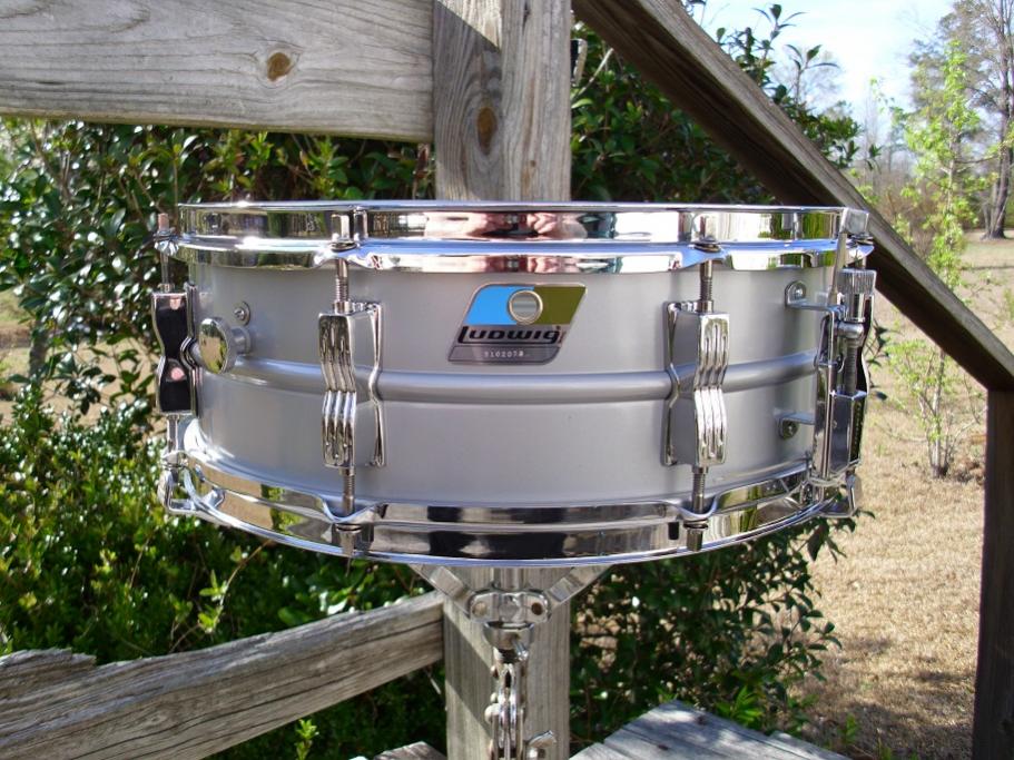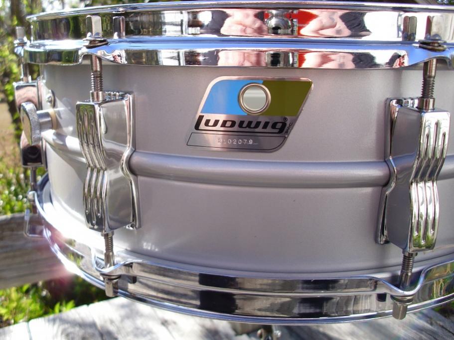 this is a beautiful Ludwig rounded corner blue olive badge acrolite, 5x14 8 lug, serial number 3102079. same ludalloy shell as the supra. this one is in superb condition. the shell is excellent with no issues. when I was detailing this one, two lugs had the threaded posts cracked, so I purchased two new Ludwig bowties lugs to replace those. they match perfectly. all the hardware is in great shape. chrome on the hoops and lugs look like new. 12 hole black face p-85 works nicely. has the proper block logo snare butt. has the original 2517124 12 strand wires with original cords. large round knob muffler works just as it should. I installed brand new heads on it today, remo coated ambassador batter and a Ludwig snare side head. its completely detailed,tuned and ready to play.