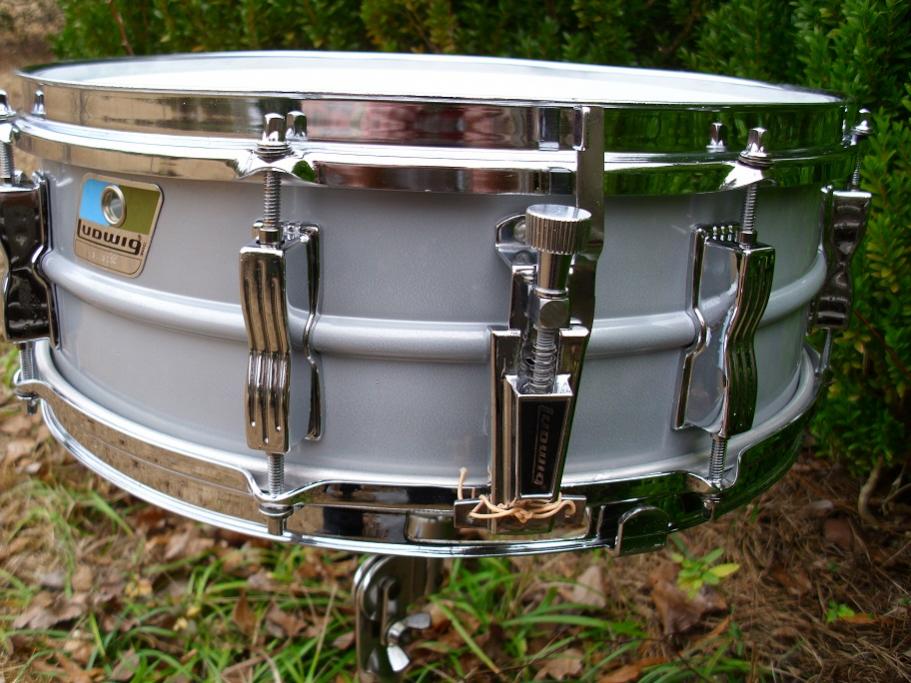 This is a very sharp looking 5x14 8 lug blue olive badge Acrolite. Serial number is 3113220. This drum is all original with the exception of heads and snare cords. Has a new Remo coated Ambassador batter and a fresh Remo ambassador snare side head. One dimple in the bottom head. I installed new Ludwig snare cords. The blackface 2 hole P85 strainer is nice and smooth. Has the proper block logo snare butt. Large round knob muffler works great. Chrome hardware is very nice with just a bit of pitting on some of the bowtie lugs. The hoops are like new. All matching tension rods and washers present. Shell has no scratches,scrapes or dents and has a nice look to it. Has Ludwig metal tip 20 strand wires. These late issue b/o Acros have lugs that can break at the lug mounts. I upgrade all of these with new longer machine bolts that go further into the lug casting. So, now better than the original design and no worries with this setup. This drum looks and sounds great. I spend 5-6 hours on each snare drum that I prepare. Would be hard to find one any cleaner. Same seamless Ludalloy shell as the Supraphonics. Drum has been completely detailed, tuned and ready to go. Please pm me here or email to [email]mikelayton@bellsouth.net[/email] if you have any questions. Thanks for checking it out. I will ship it out quickly for you.