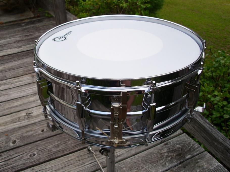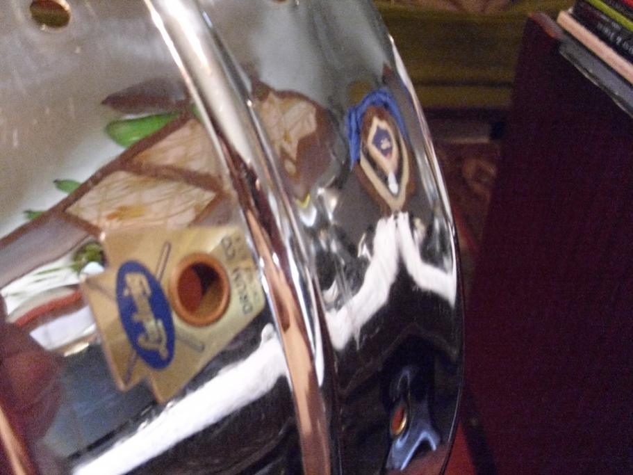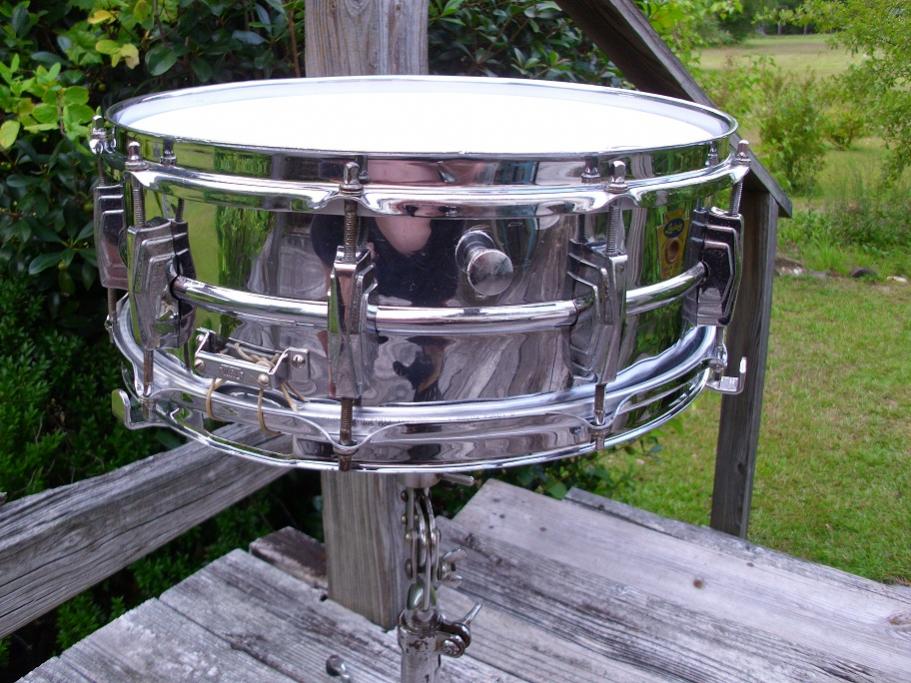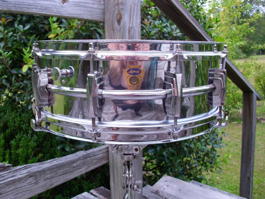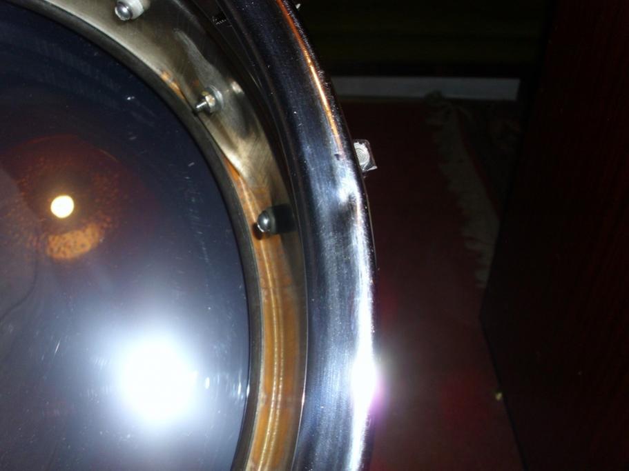 This is a late 50's Super Ludwig. This is the highly sought after chrome plated brass 5x14 model. These are 10 lug models with imperial lugs and a seamed shell with crimped snare beds. Being a 50 plus year old drum, this has seen some play time, but it still a fine looking, great sounding drum. The overall chrome plating is very nice. It has some dings and dents on several panels. At the bottom of the shell under the badge, there is a bit of a lip or raised portion at the edge. This area is covered by the head and the hoop. The drum takes heads easily and tunes right up with no problems at all. The batter inside flange edge also has a ding but does not cause any issues at all. I just like to be up front about these things and have taken photos as well.