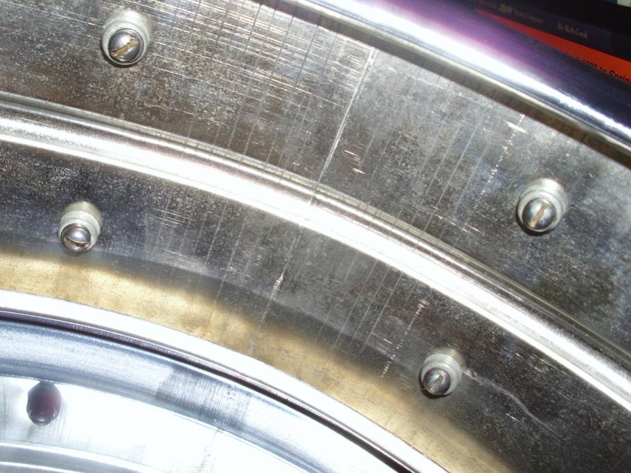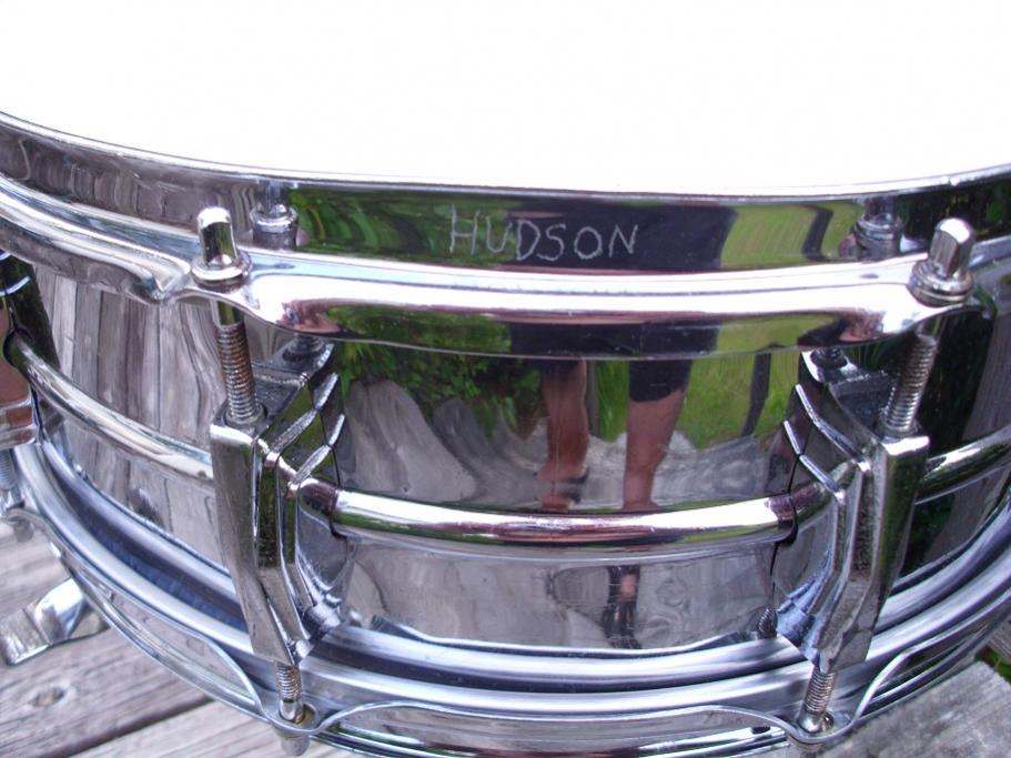 The drum weighs 8.67 pounds fully dressed out. Interesting thing i ran across. I have two of these. i weighed both with just the bare shells. My other one has the same badge. This shell of this one is heavier at 1341 grams as opposed to the other at 1264 grams. It has original COB hoops which are in nice condition. Someone put their name in the batter hoop as shown.."Hudson". It has a Ludwig 3/4" small knob muffler that works perfectly. The strainer is a Wfl P83 which is what many of these came with. But it is nickel instead of chrome. It also has a chrome Wfl snare butt. It is currently equipped with 20 strand snare wires. It has new heads, Aquarian Hi-Velocity head on the batter and an Evans Hazy 300 on the snare side. There is some pitting on the lugs. These are the early design that are much beefier than the ones that Ludwig later used.