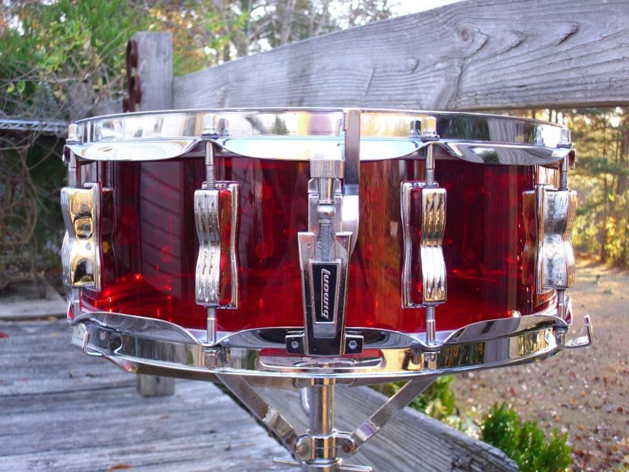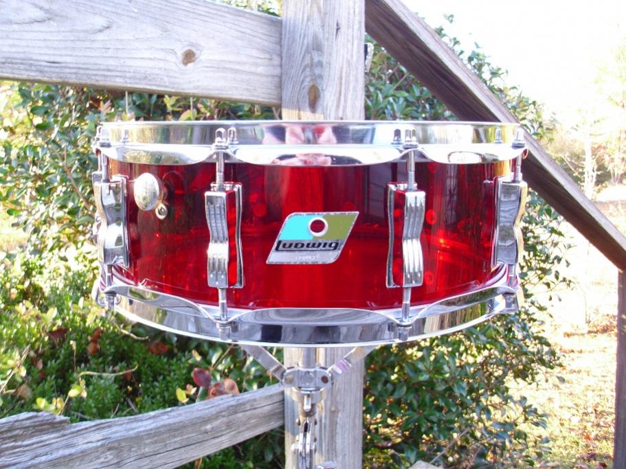 this is a beautiful 70's blue olive pointy badge, Ludwig 10 lug red vistalite snare drum. this drum is all original with the exception of heads. it is in spectacular condition. no issues whatsoever. all chrome hardware is very nice. has blackface 2 hole p85 strainer,script logo snare butt and Ludwig 16 strand wires, large round knob muffler. the shell is in amazing condition, serial number is 1068837. drum has been completely disassembled, inspected and detailed. its ready to go. has a nice older remo weatherking diplomat batter head and a remo hazy snare side head. new Ludwig snare cords as well. this one will make someone very happy! feel free to pm me here or email to [email]mikelayton@bellsouth.net[/email] if you have any questions. thanks for looking. ran out of daylight for pics,thus snare wires not shown in pics.