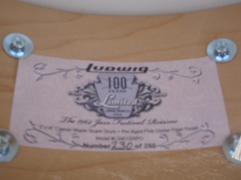 This is new old stock! Ludwig made 250 of these back in 2009 for Guitar Center. I bought this new from Guitar Center about 3 years ago. I played it for a few minutes and tucked it away for safekeeping. The original box was gone by the time I purchased it. This is a 10 lug, 7 ply classic maple, 5x14 drum. I think Ludwig called them Jazz Festival reissues. This one has a label inside and designates it as number 230 of 250 made. It has bowtie lugs, P85 strainer and p33 snare butt. Has original Ludwig 100th anniversary heads and 20 strand wires. This are also fitted with the 100th anniversary badges as well. The drum is completely original. These have a wonderful sound to them and will certainly be sought after by collectors. Hate to sell it, but finances say otherwise. Please pm me here or email to [email]mikelayton@bellsouth.net[/email] if you have any questions or need more pics. Thank you.