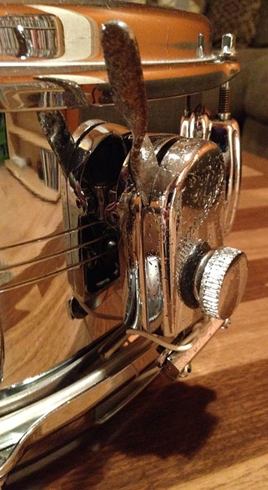 For sale is a chrome over brass Vintage 1960s Slingerland Sound King 5x14 Snare with 8 lugs and zoomatic throw (good amount of pitting on the throw), original snare wires and new heads. Serial is #231476.