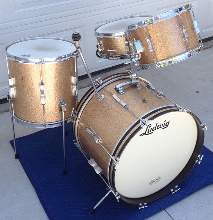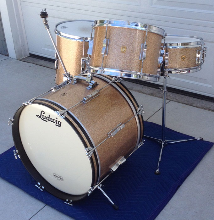 For sale is a gorgeous factory matched Vintage 1965 Ludwig Club Date Set in Champagne Sparkle with chrome hardware. 20/14/12 and matching 6 lug Pioneer snare. Superb players condition. Minor scuffs on wrap and chrome here and there as well as minor oxidation in some areas. Minimal fade on wrap which is tight. Very slight seam lift on bass. All shells in-round and edges are spectacular, original shape. Bass hoops have been repainted. All shells date stamped in black with date of MAY 11, 1965 (bass is smudged so harder to read) except for the snare which is in red and reads MAY 8, 1965. I have never seen a set with almost all matching date stamps! These guys just turned 50 and looking great. Includes cymbal arm which may not be original or Ludwig. Snare stand shown not included.