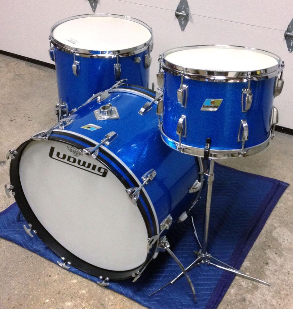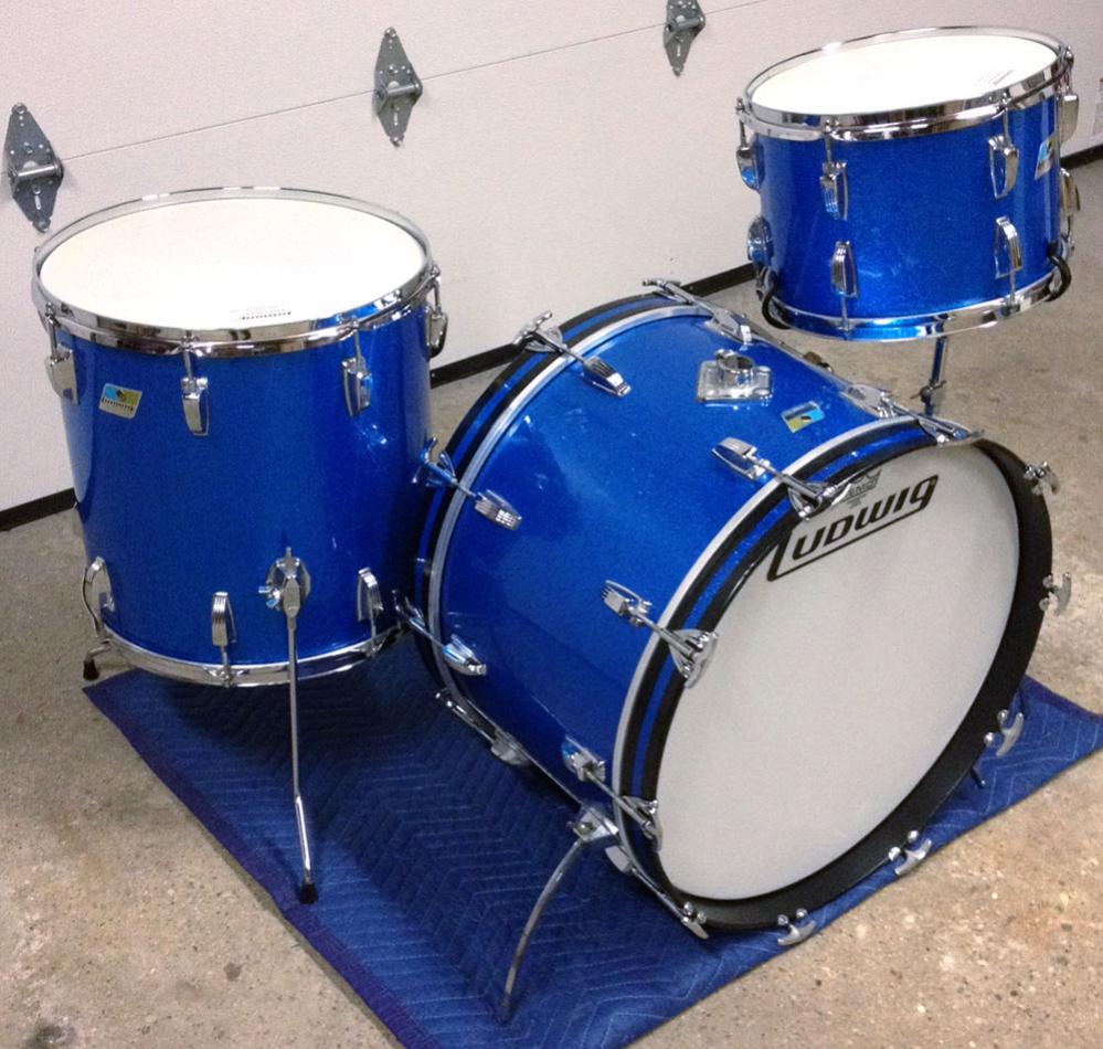 For sale is a Vintage 1970s Ludwig Blue Sparkle Classic 22/16/13 Set. Great players condition. All shells in-round and feature original bearing edges in great shape. 13 and 16 interiors are clear maple. 22 interior is grantione. Wrap is brilliant, clean and tight with minor scuffs here and there. Some rash on either side of bass drum top - as shown in top of wrap detail photo. There are two unoriginal holes in the 13 from a post-factory mount that have been professionally filled and barely noticeable as well as minor indentions from said mount - as shown in bottom of wrap detail photo. All seams are decent. Chrome is pretty clean with minor oxidation. Could use a deeper detailing and polishing in areas. Snare stand shown for 13 is included. I will also include a proper double post mount, but the arm mount bracket on the 13 is positioned for a right sided bass drum mounting. Could use new heads on entire kit. Both batter tom heads look to be originals. All drums feature the Blue/Olive pointy badges with minor scuffs and serials are as follows: 22 bass #1116454, 16 floor #1116269 and 13 tom #1116453.