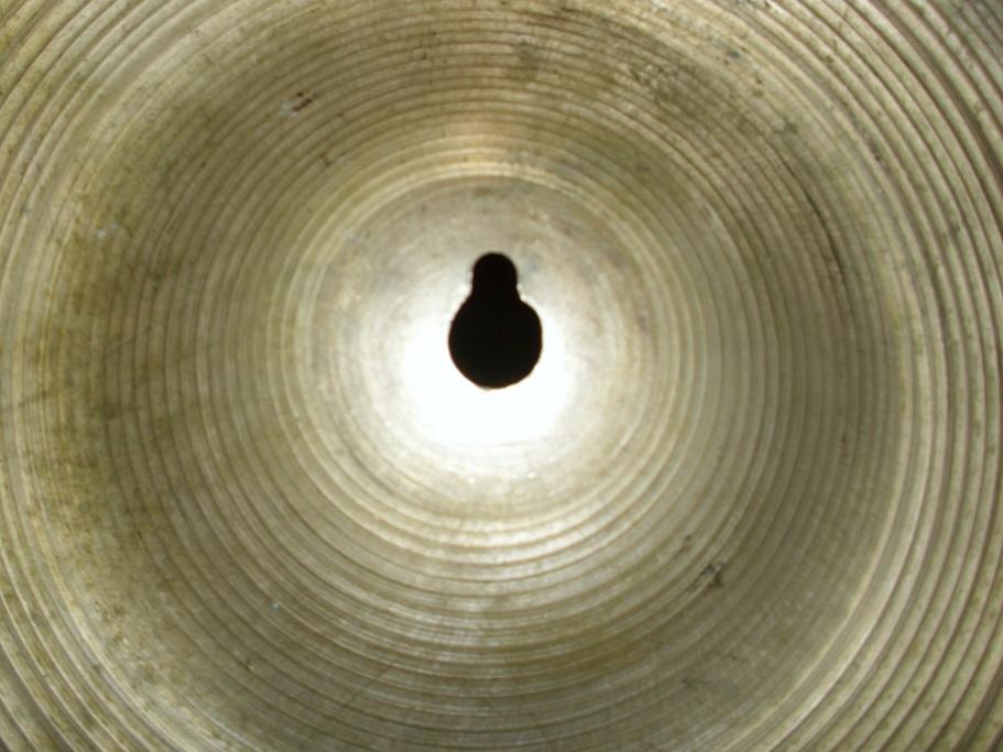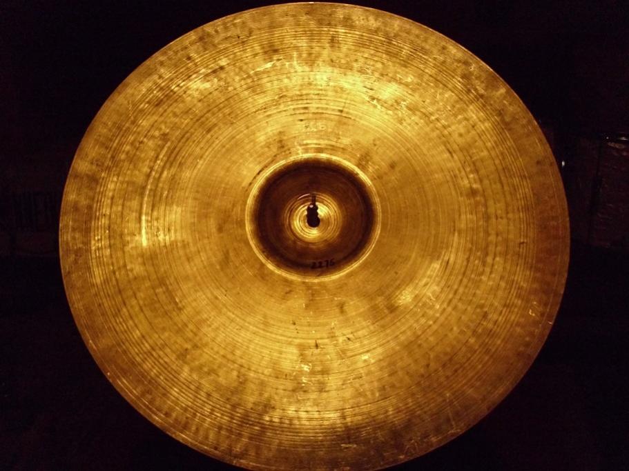 This one is very dark and has some varied lathing that produces some nice sounds. The cymbal crashes well. The weight is 2275 grams. There are no cracks or any damage to the cymbal. It has been used quite a bit and shows some scratching, stains and keyhole. The bell is very full sounding. The hand hammering is evident but be could seen better if the cymbal was cleaned. I'll leave that chore to you if desired. At this weight, the cymbal is very versatile for most all types of music.