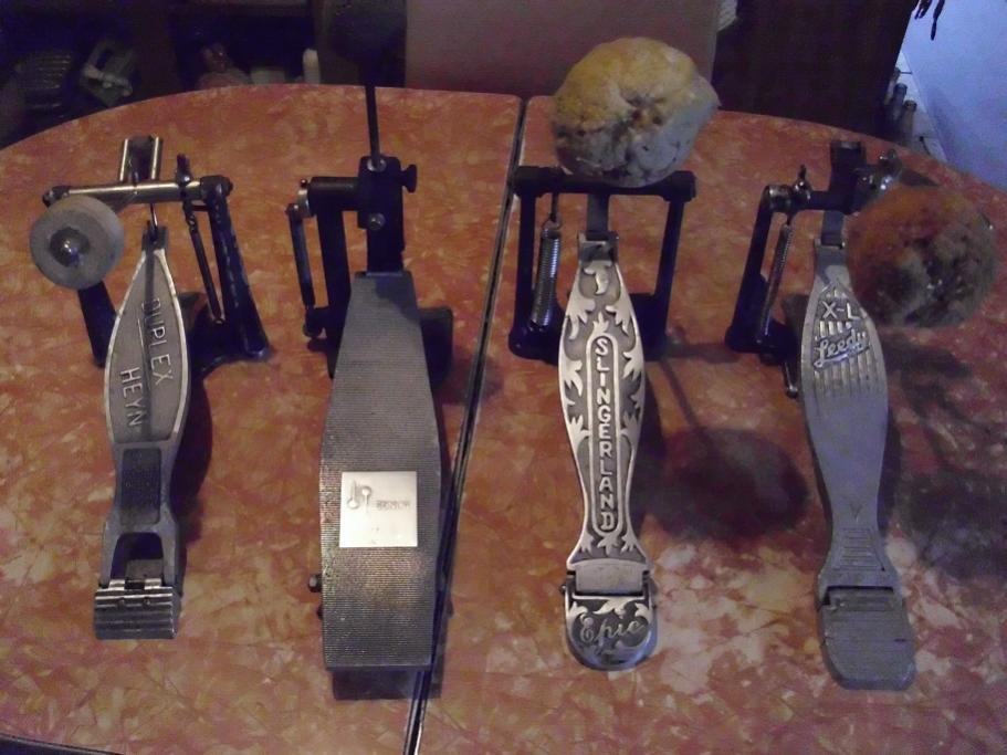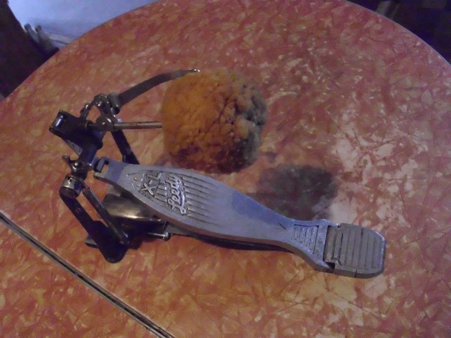 4-Leedy X-L Pedal. this is a neat one! this one has a nice loose action as it is adjusted right now. the footboard has plenty of wear in the center section. i'd say this one saw a gig or two! the lambs wool beater on this one is superb having hardly any major wool loss. this must be an older one as it also has the bass cymbal striker attached to the beater. these are getting hard to find. it can also be removed if not desired.