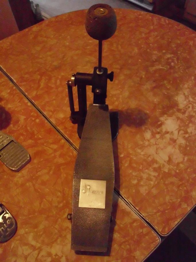 2-Sonor 60's Pedal. don't see too many of these around. I think its a mid 60's model as I researched it when I first bought it. appears to be original. the beater is larger at the bottom and tapers in at the top. beater has a few little holes in the surface on one side. the black paint on the frame is in great condition. this one has a cool, simple design with having only one tower. the footboard has hardly any wear and has the trademark sonor design on it. functions nice and smoothly.