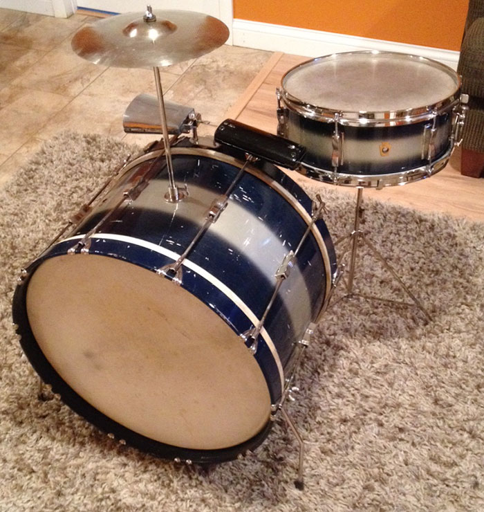 For sale is a Vintage Late 1950s WFL Dance Outfit in Blue/Silver Duco with nickel hardware. Consists of 14x22 bass and 5x14 6 lug Pioneer snare with nickel over brass hoops. Bass drum has single tension rods and has a bit more wear and flaking in the finish than the snare. Shells are in great, clean in-round shape and edges look good and original. Includes straight cymbal holder with cymbal, spurs, hoop mounted muffler, hoop mounted block and cowbell and snare stand. Everything appears to be original besides the cymbal, cowbell and snare wires. Overall a very clean, fun, original kit!