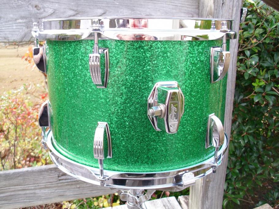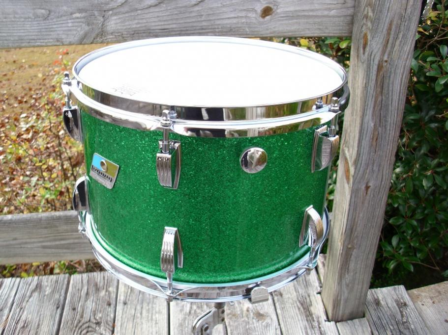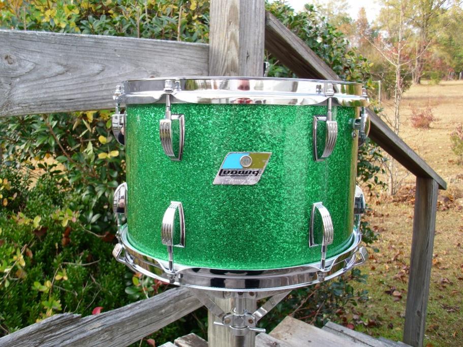 this is a beautiful example of Ludwig original green sparkle. this is a 70's b/o pointed badge 12" super classic tom. this one is 3 ply with original granitone interior. this drum is all original with the exception of the heads. the wrap is flawless and has zero fade. the badge grommet is tight and untouched. serial number is 1229830. all chrome hardware is in fantastic shape. has large knob round felt muffler. has a newer attack clear reso head and an older remo weather king ambassador batter head. badge has a few scratches and lift at the corners like many do from this period. i'll be glad to glue them for you if you desire. I have fully detailed the drum and it needs nothing. green sparkle is a desirable and often very hard to find wrap. would love to keep it in my collection. but finances say otherwise. you'll be happy to own this one. please pm me here or email to [email]mikelayton@bellsouth.net[/email] if you have any questions. thanks for looking.