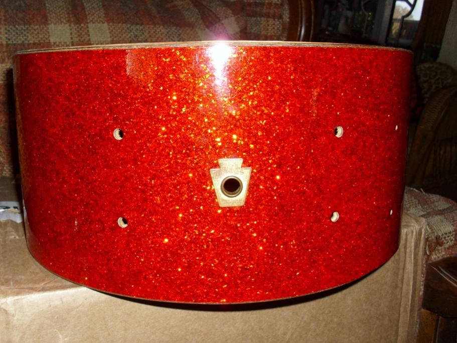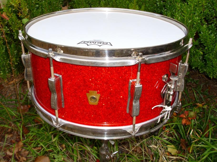 Just in time for Christmas! This is a 55-57 badge WFL 6.5x14 8 lug model in Red Flash (red sparkle,sparkling red pearl). The '55 and '57 catalogs call these "Contest Model Concert Drums". These are more commonly known from the 60's as "Auditorium" Models. They are essentially the same as a Jazz Festival but in a 6.5 depth. This one looks and sounds amazing. These are 3 ply Mahogany/Poplar/Mahogany shells with maple re-rings and natural interior finish. The wrap is very vivid with absolutely zero fade. Wonderful to find a drum this old in such nice shape. There is one panel that has a light scuff mark on it and that's it. Hoops are nickel over brass with drop gates on the snare side. This drum is completely original with the exception of the new heads and snare cords that I installed. It has the original amber tip 12 strand wires. Has the WFL P83 strainer and WFL logo snare butt. New heads are a Remo coated ambassador up top and a Remo hazy ambassador on the snare side. Drums from this era have nice deep snare beds and a beautiful vintage sound. Drum has been completely detailed and needs nothing. The nickel hardware would polish up even better if you chose to do so. Pictures don't do it justice. Please pm me here or email to [email]mikelayton@bellsouth.net[/email] if you have any questions. Thanks for checking it out.