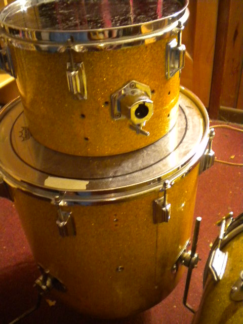 It's time for the holidays and I found me a new xmas present that I want! And I'm also getting out of the vintage drum business and I'm gonna leave that to you professionals! The first drum set is a 3pc Rogers Transition Dayton - It has the bow-tie t-handles - this is a project but the wrap is good, gold sparkle and needs bottom lugs and rims - It's a 20" bass, 12" tom, 16" floor tom - all the stickers are present, flat grey interiors - Says Holiday Dayton Ohio = $325 plus shipping.