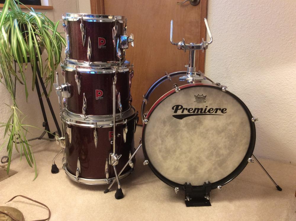 Custom Premier brand stickers on the drums.