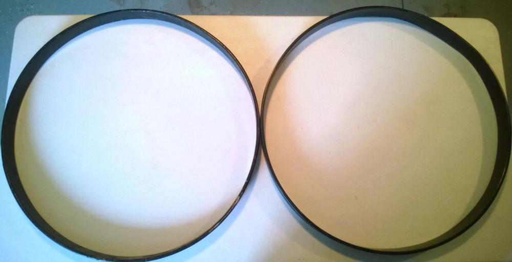 [COLOR="Blue"]SOLD •One set of 22” bass drum hoops 1 ¾ inches wide with a ½ inch inlay channel. I believe these to be Ludwig but am not 100% sure. They’re not perfect, and one has a flat spot on it as if it was positioned on the under side of a bass drum for some time. I don’t think it would affect tuning or anything like that. Nice strong project hoops! $60 shipped OBO. SOLD[/COLOR]