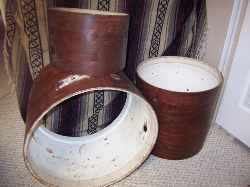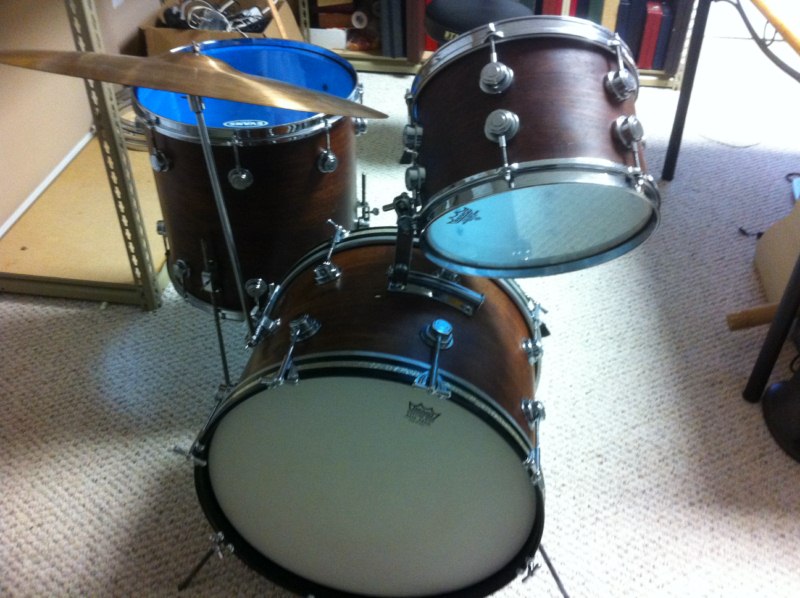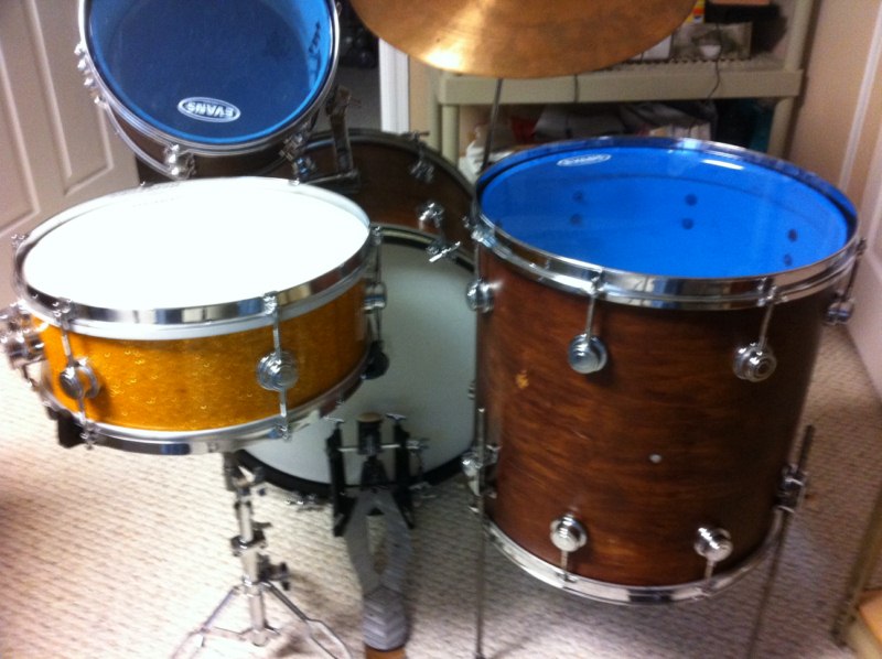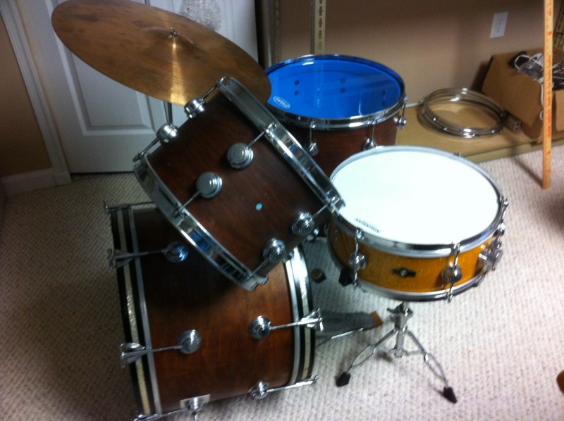 FINALLY, even though I'm only about half way done, I decided I wanted to see what this kit looks/sounds like put together. I gathered up some spare heads, used some plastic washers and re-built myself a George Way drum kit!!