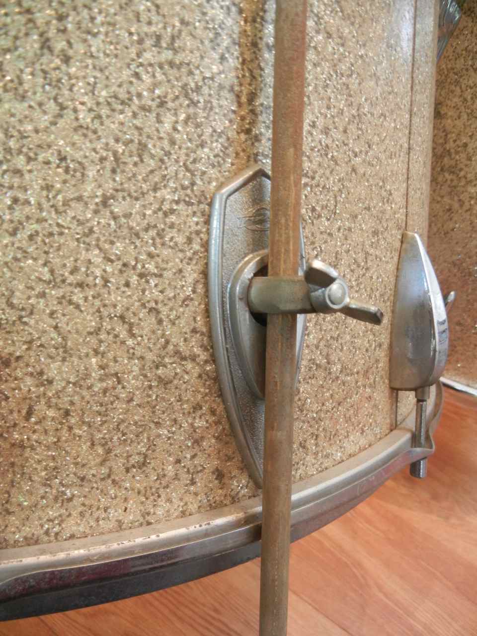 I found a few small spots on the bass drum edges of, what I believe to be, the original color. It appears to be Gold Sparkle. I still find it very strange that there is none of the original color left under the lugs, brackets and mounts. (see picture)