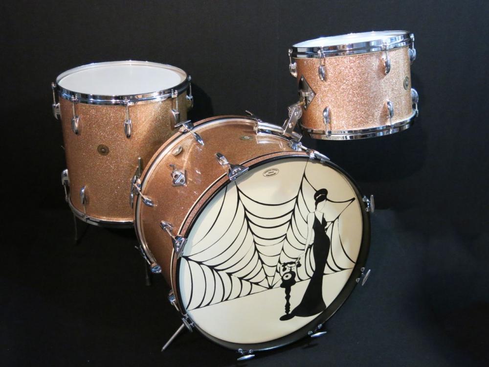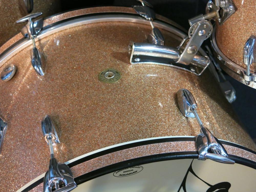 22x14: The bass drum is in great condition! The interiors are very clean with the original tag. The bearing edges are original and sharp. The wrap on the shell is original, seem is tight and there are no chips or any damage to the wrap. The very top of the bass drum shows a couple of dark spots, where is seems the wrap didn't have a few pieces of sparkle. See photo. The bass drum hoops have been completely refinished. Hand sanded down to bare wood and repainted. The inlay is new production champagne sparkle - but considering the minimal fade of the kit, this inlay actually matches better than some of the original inlay found on these kits. All of the hardware is original and in great condition. The wing screw for the cymbal arm mount has a bent wing/arm.