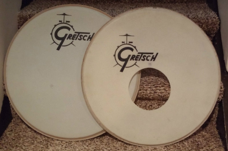 Original factory (at least I'm assuming since they're silkscreened) 20" Gretsch bass drum heads. One has a hole. Both will clean up nicely with a magic eraser, but I'll leave that up to the buyer. They came with a 60s round badge kit I had for a short time. I have no idea what era they belong to.