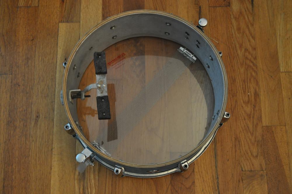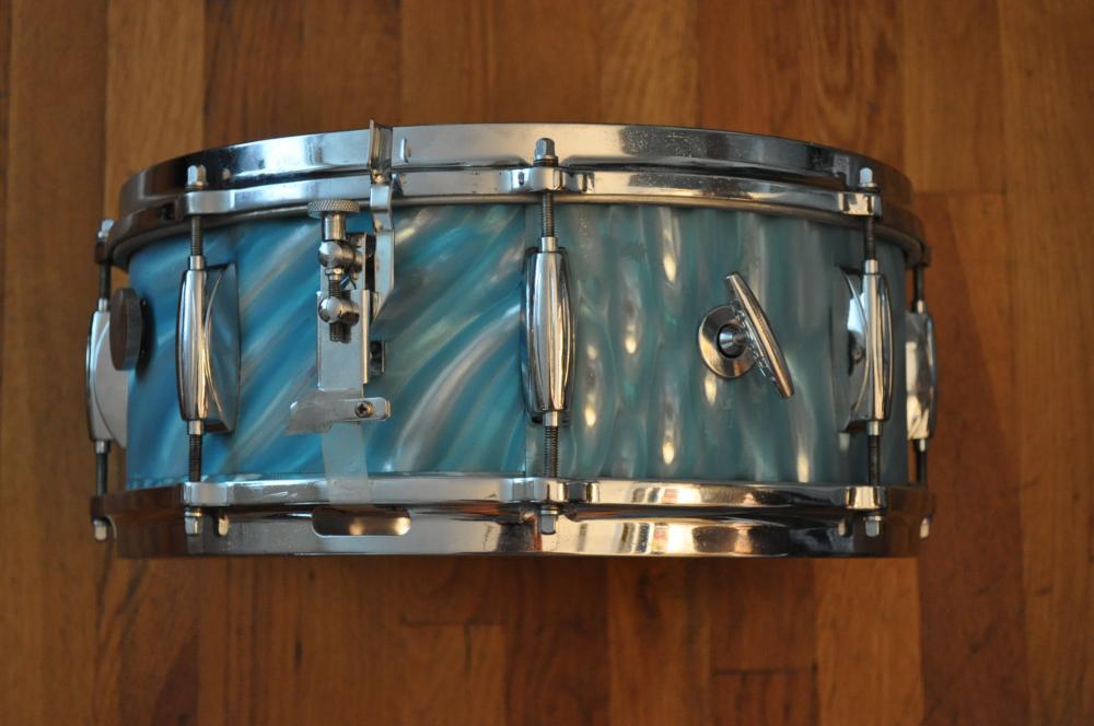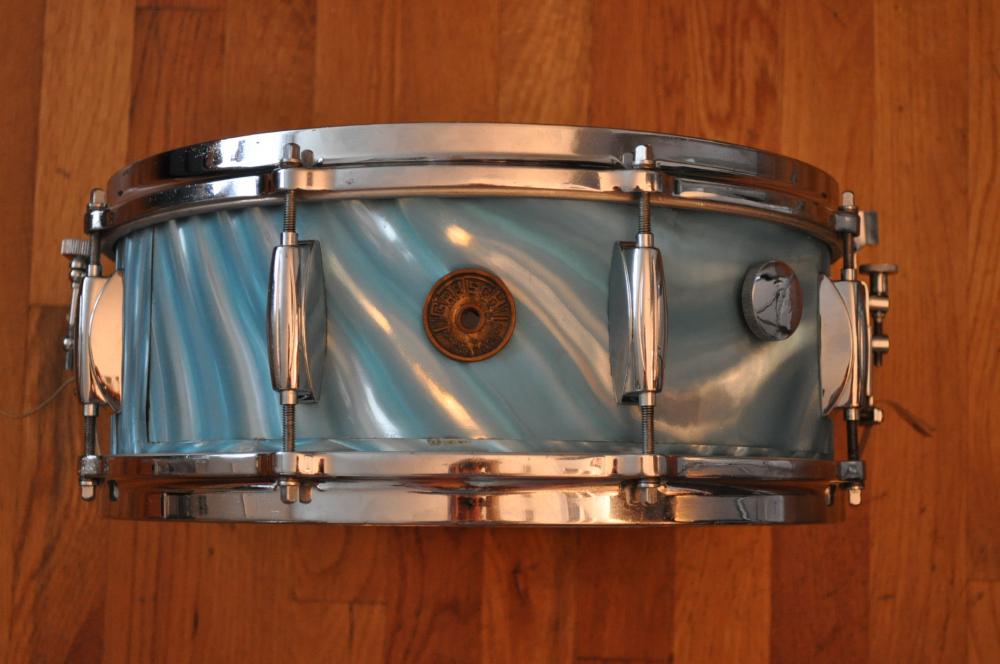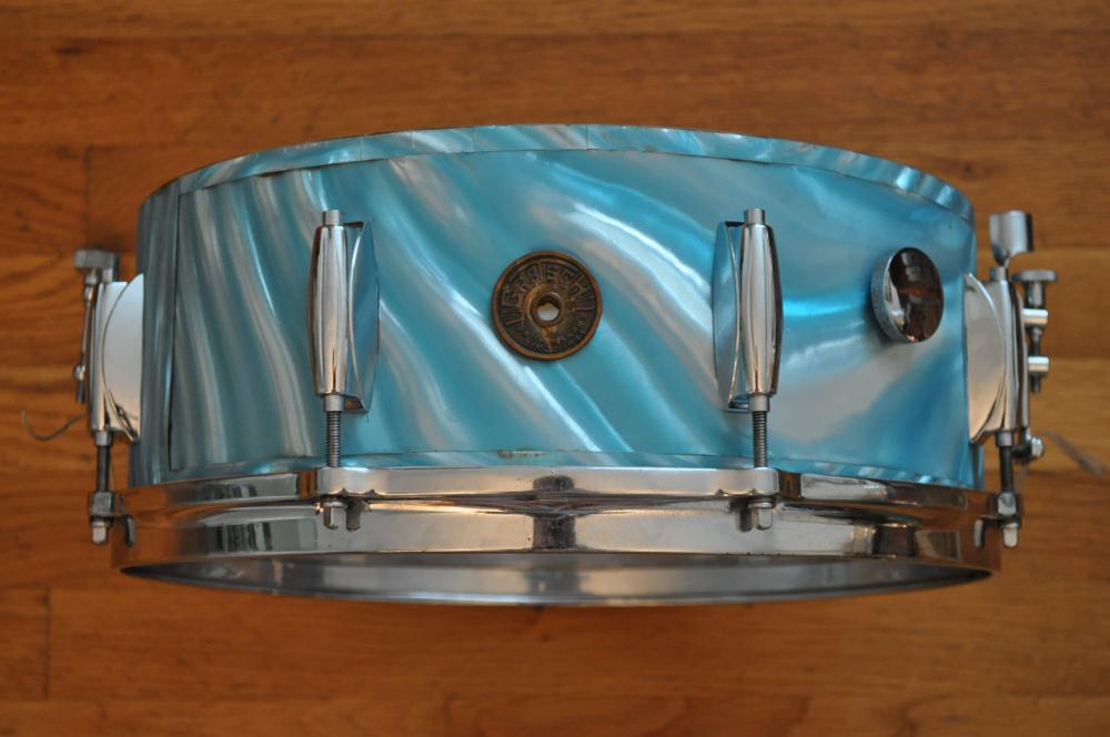 Late '50s/early '60s Gretsch 4157 snare drum in original aqua satin flame. The drum is solid but has typical cosmetic issues: rough wrap, lifted round badge, and a small extra hole from a non-original strainer (new Micro-sensitive strainer will remedy that). The chrome is decent overall, and the interior and edges are excellent. Remo, etc. heads fit easily, which is a big plus. A great player's drum with plenty of mojo! Gretsch drum key not included.
