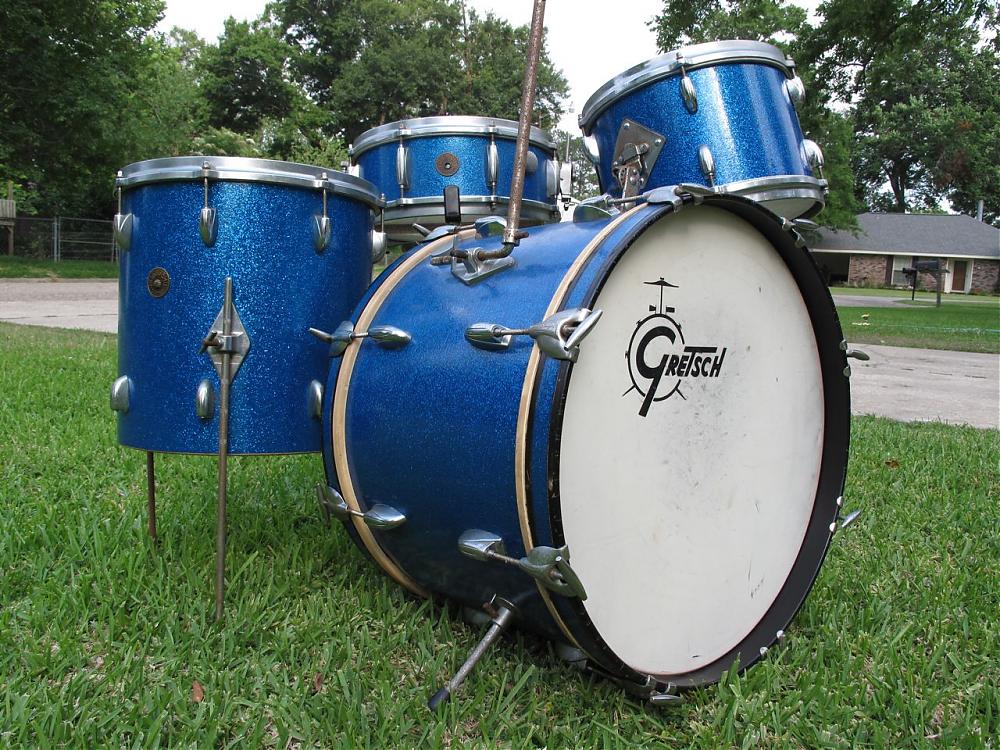 The bass drum is very nice. The wrap and shell are in great condition. The hardware has aged like the rest of the hardware on the kit. The worst case being the rail mount. The drum has the ORIGINAL heads on front and back!!! The hoops are super clean for never having had the black paint refinished. They each have a small section (1-2 inches) of wrap missing on the bottom. VERY CLEAN otherwise! The corners of the wrap have small sections missing.. but this is very common amongst gretsch drums.. due to the slightly larger shell dimensions.