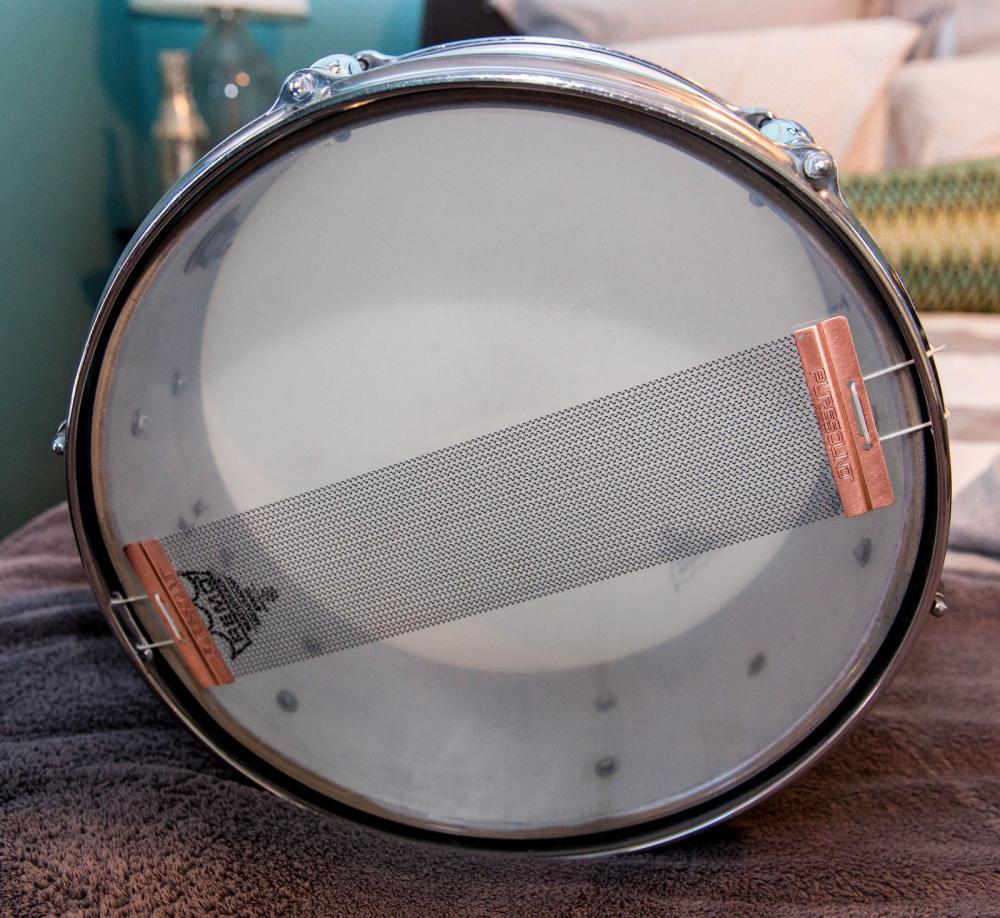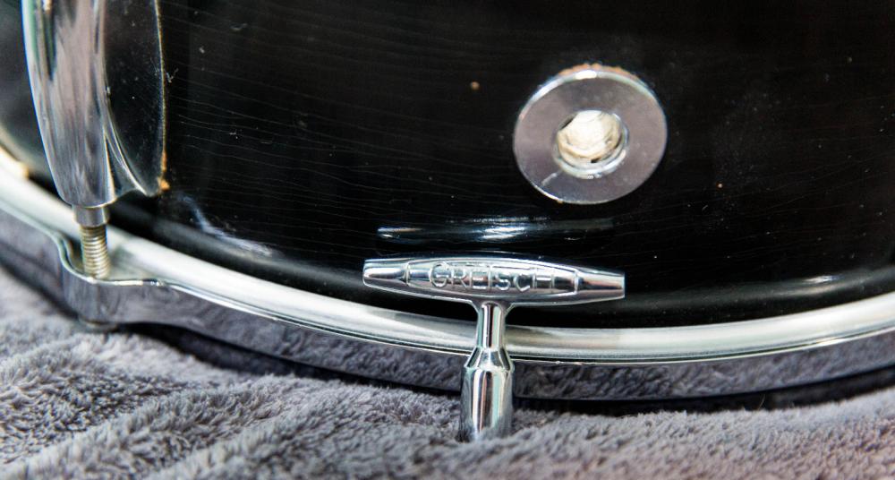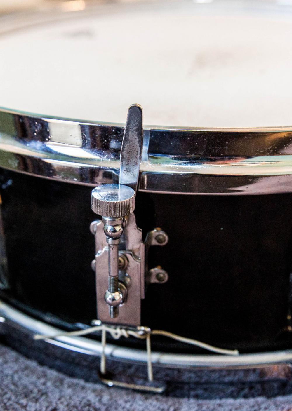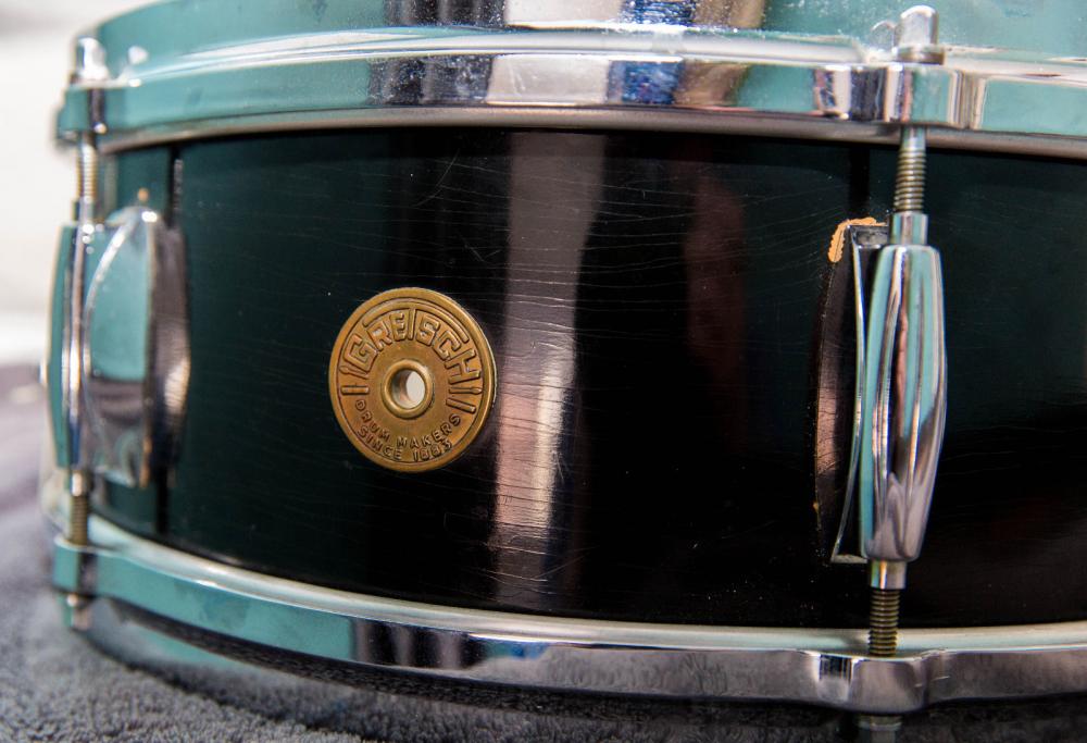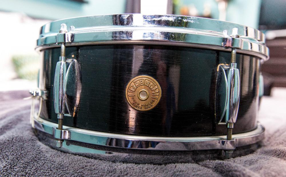 Late 50's or early 60's Gretsch "Renown" model snare drum, Model 4102. 6 ply molded shell, fully flanged hoops, positive throw, snap-in key/holder and silver sealer interior. Super 30 Puresound wires, Remo vintage "A" batter, and Ambassador clear resonant head.