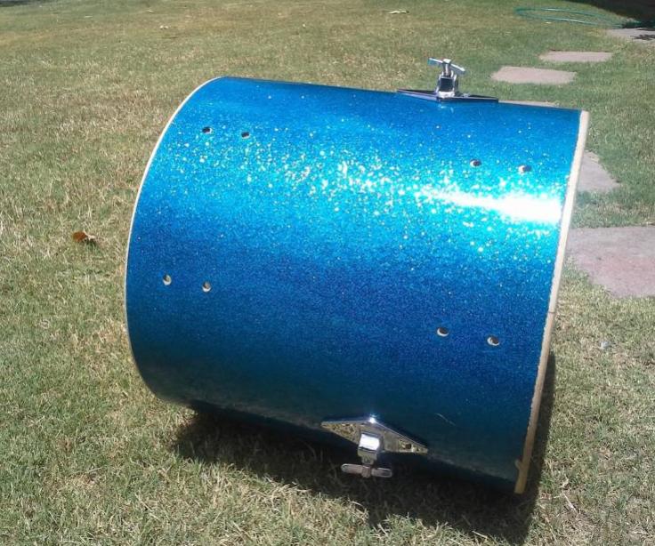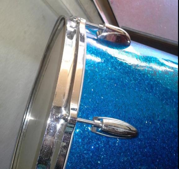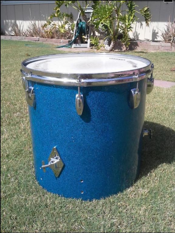 This Gretsch tom sports the original orange peely blue glass finish. I had to reattach it but it is the original to the drum. Shrinkage is why the holes on the wrap aren't perfect but they're hidden under the lugs. The only questionable spot might be the muffler holes. The mufflers for these have big knobs, so it might be fine. The wrap has a chunk that cracked off but I reglued it back on. There is also two barely visible cracks that are about an inch long in other areas. Other than that the wrap is actually really good and bright with a nice shine. No fade. Actually I can't see any at all. And thats probably because someone painted it black, so I had to remove that paint. The chrome has scratches. The tag is there and the interior is decent. The bottom bearing edge is decent right on the edge however theres some chips at the inner ply here and there but don't cause drastic highs or lows. The leg brackets are much nicer than the rest of the chrome. They're almost perfect with white paint still in the lettering. I have more pics at request and can take more if needed. Again, this is the original blue glass wrap with no fade. I've seen unwrapped project shells go for 150+ so this has got to be better than that. I'm looking to get 275$